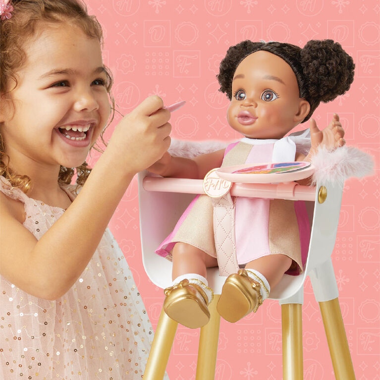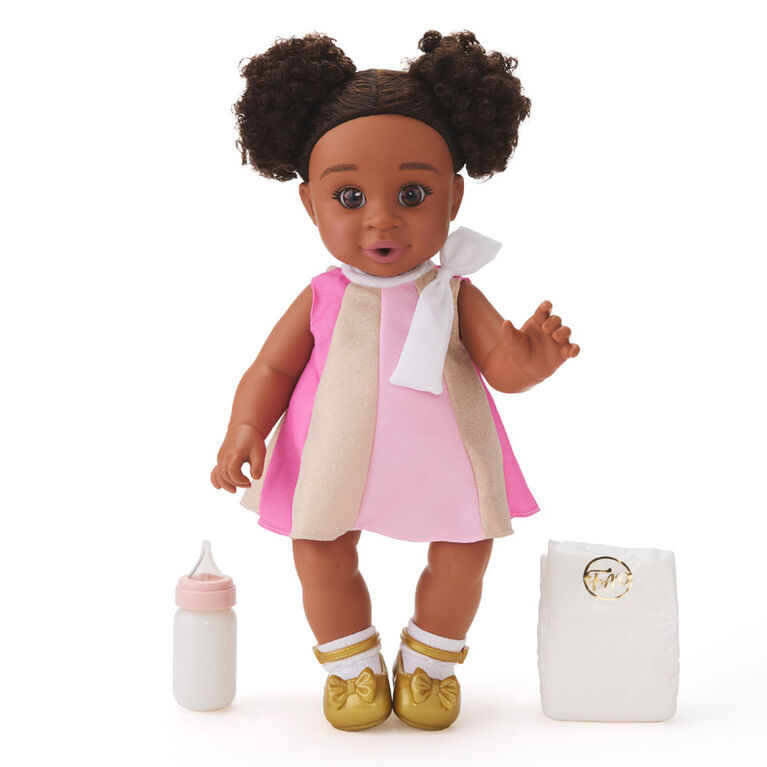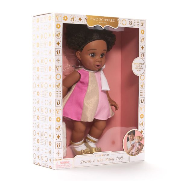 Unique, only available at our store. The F.A.O. Schwarz Drink & Wet Baby Doll brings a new level of interaction to doll play. Perfect for toddlers 18 months and older, this 35cm doll boasts lifelike detailing, including realistic, brushable hair and a bathable body. Teach your child nurturing skills by feeding the doll with its own bottle, then watch as they learn about caregiving through changing the doll’s wet diapers. Outfitted in a cute dress with diaper cover, socks, and shoes, this set also includes an extra diaper and a birth certificate for naming and personalizing the doll. This engaging toy not only entertains but also encourages nurturing play and helps develop responsibility in young children, making it a valuable addition to their toy collection.
