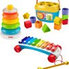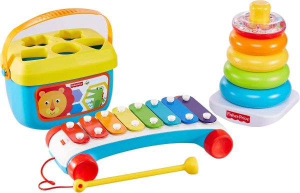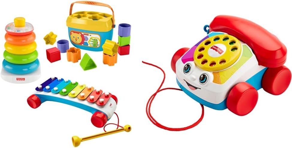 - Set includes 5 toys – Rock-a-Stack for sorting and stacking, Baby's First Blocks for problem-solving, Classic Xylophone for pull-along musical fun, Chatter Telephone for early role play, and a pull toy with ringing sounds.