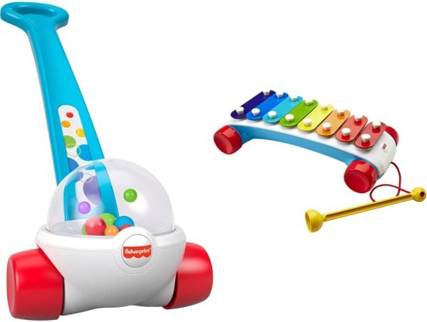 - Both toys are designed to be easily pushed or pulled along by toddlers, with the corn popper emitting ball-popping sounds and the xylophone featuring a tethered mallet for tapping the keys.