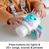 - Press the 2 buttons for lights and 20+ songs, sounds & phrases that introduce the alphabet, counting & colors; Use the globe button to select a language: English or French