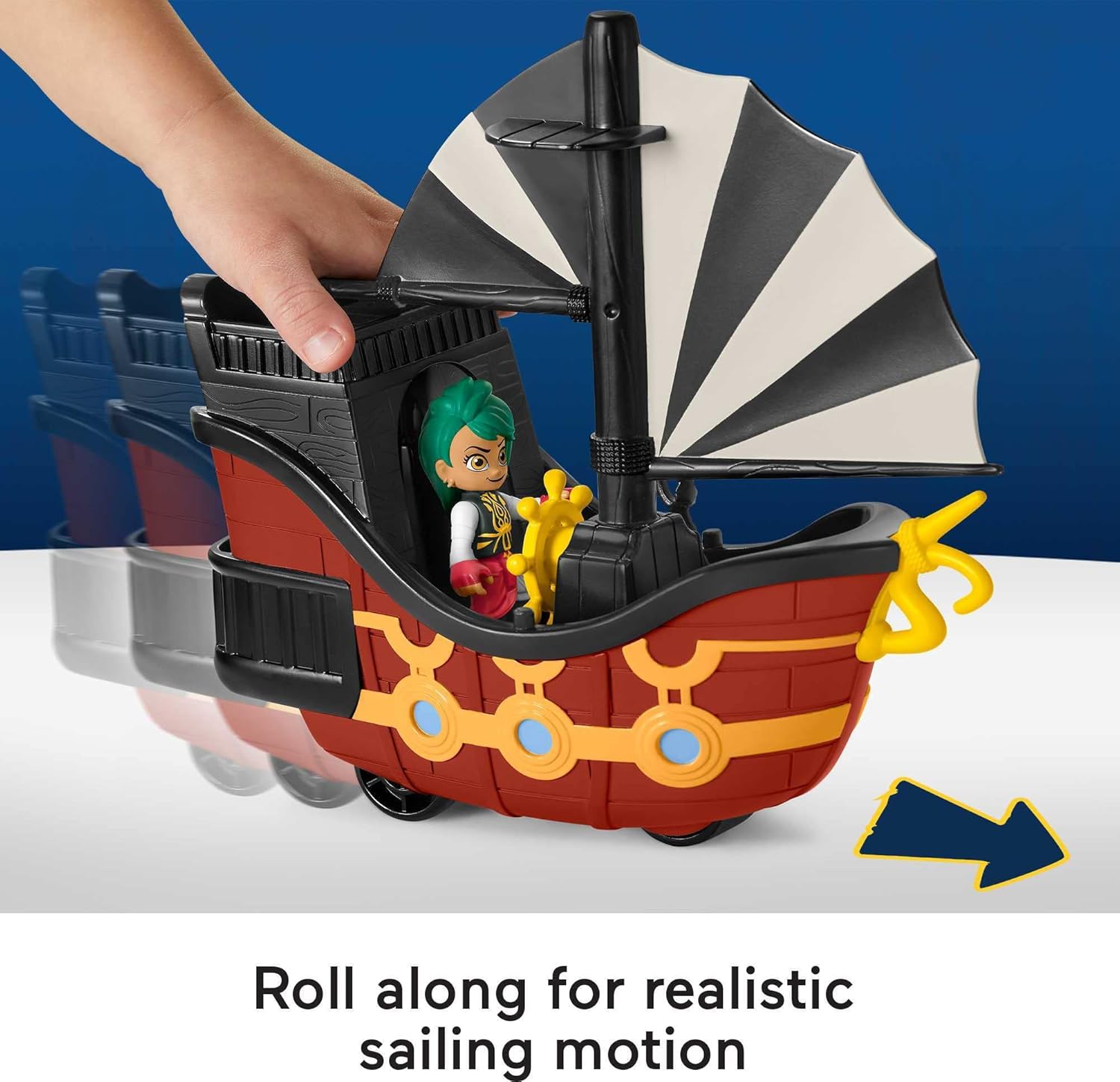 Kids can act out their own action-Packed pirate adventures, just like on Nickelodeon’s Santiago of the Seas, with this push-along vehicle and figure set from Fisher-Price. Young swashbucklers can place the poseable Bonnie Bones character figure aboard her ship, El Calamar, and roll the ship along to send the pirate “sailing” into action with realistic rolling waves motion. Look for additional Nickelodeon Santiago of the Seas vehicle sets from Fisher-Price for more preschool-friendly pirate play! (Each sold separately and subject to availability.)