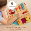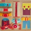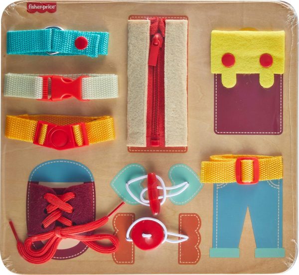 The Montessori Wooden Dressing Busy Board from Fisher-Price helps preschool kids practice self-dressing while boosting their fine motor skills. This dressing activity toy features 9 familiar clothing fasteners for kids to button, lace, snap, buckle, and zip. Made with wood from Forest Stewardship Council-certified sources (FSC-N004566) and decorated with non-toxic, water-based paint, this busy board helps foster self-confidence and independence in your preschooler. Colors and decorations may vary.