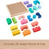 - Includes 19 shape blocks and a tray with guidelines to help kids sort the shapes into their corresponding slots