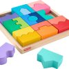 - Wooden jigsaw puzzle for kids with colorful interlocking shape blocks to stack and sort