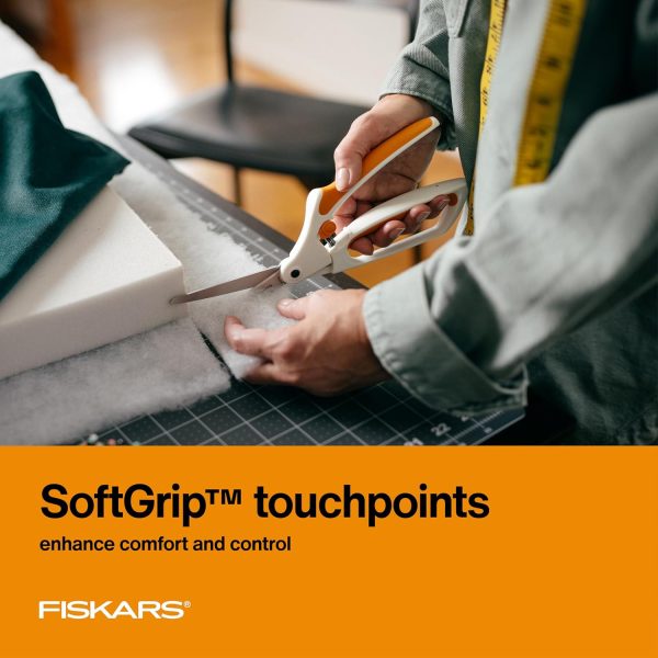 Fiskars Easy Action Scissors, No. 8 help elevate your creativity with a uniquely ergonomic design that reduces hand fatigue while making clean, precise cuts through fabric. An Easy Action spring-assisted handle gently opens the blades after each cut, reducing hand fatigue from repetitive movement. High-grade, precision-ground stainless steel blades hold their sharp edge and cut all the way to the tip. A bent handle design keeps your fabric flat for more precise tabletop cutting, while SoftGrip touchpoints provide added comfort and control. An easy-open lock keeps blades securely closed for safe storage. For every sewing project, cut with a legend.
