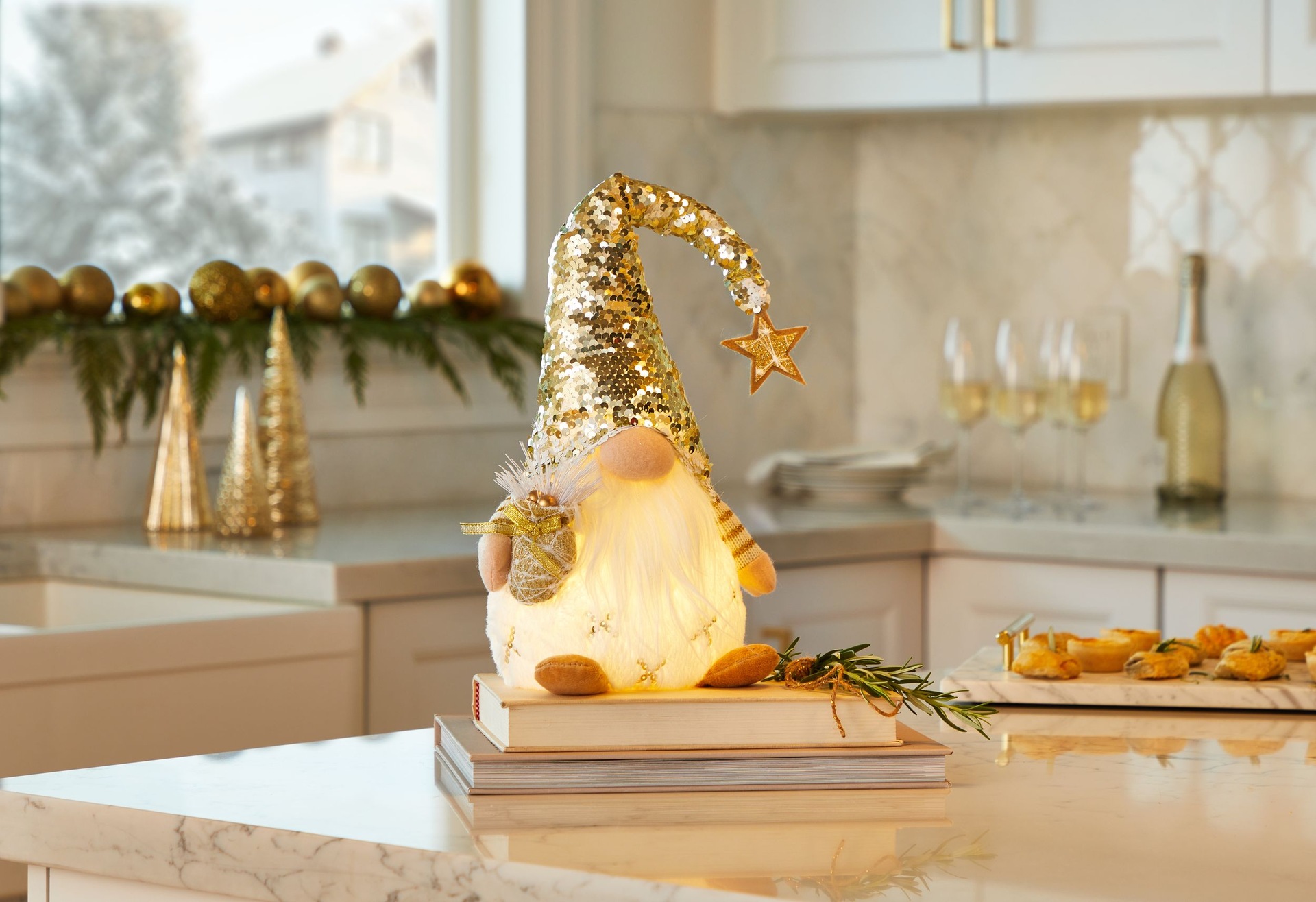 FOR LIVING Christmas Decoration Pre-Lit Sitting Gnome with White & Gold Sequin Flip Hat, 19-in