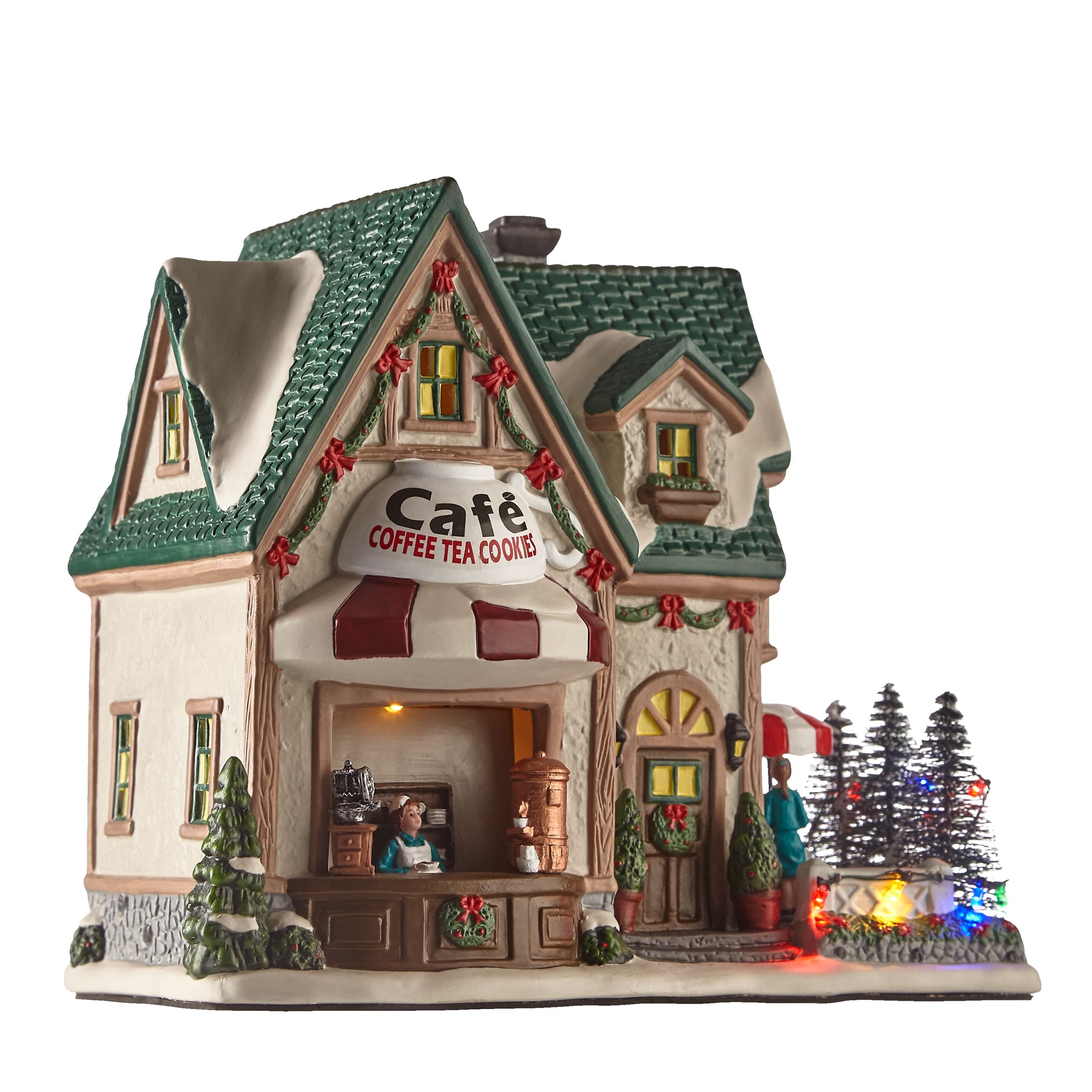 The For Living Christmas Café Village is a cozy-looking addition to your Christmas display. With a craftsman’s attention to detail, this indoor Christmas decoration’s sweet details include an aproned barista, tree-lined patio, and a green wreath with a red bow on the front door. An array of 12 multi-colour LED lights cast a festive glow over its lifelike figurines. This ceramic café comes with a DC adapter, plugging conveniently into all standard power outlets.