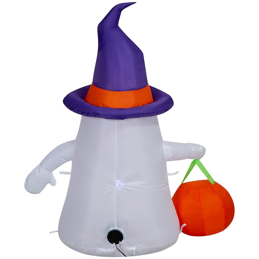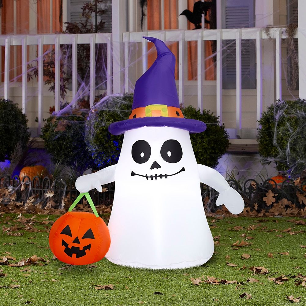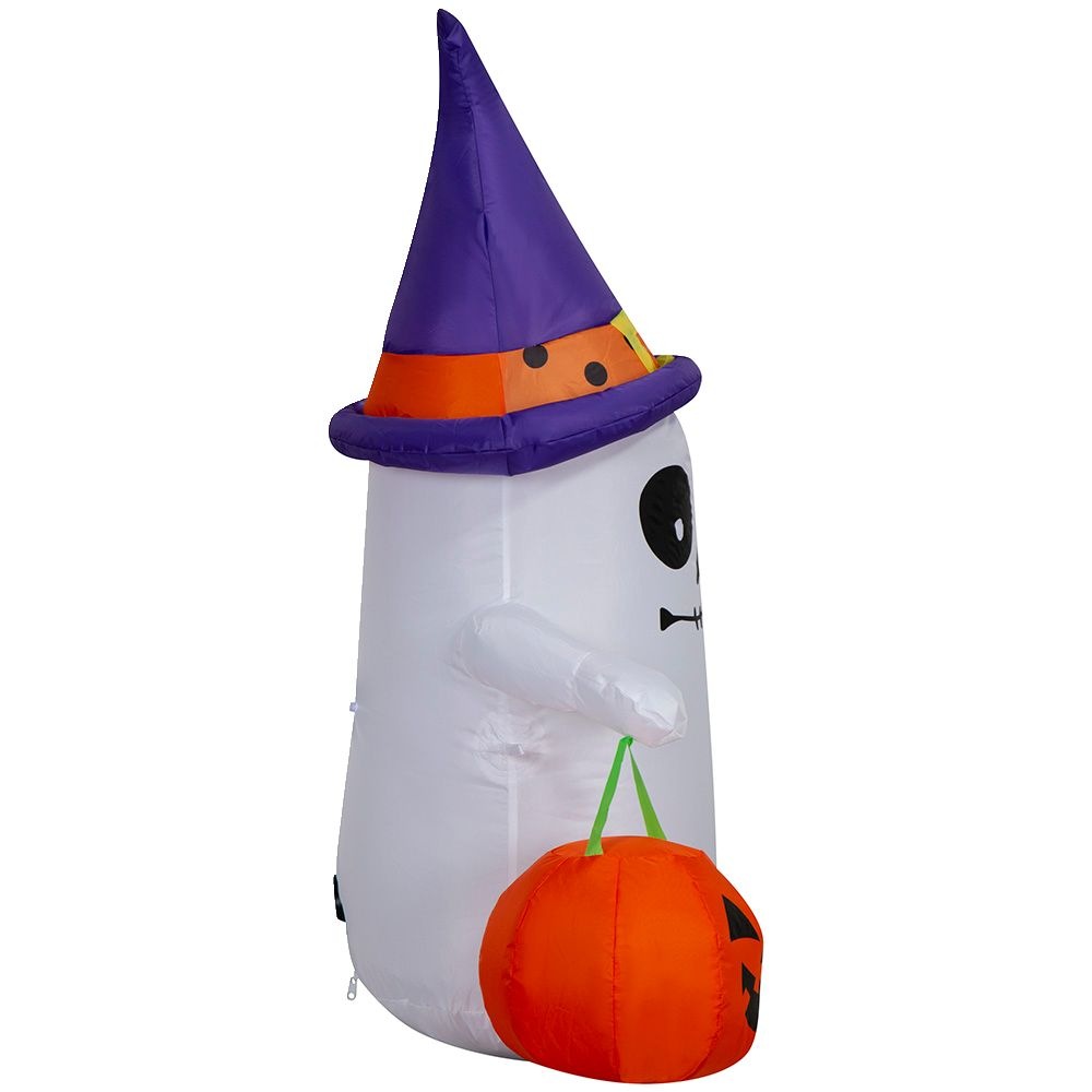 Add a spooky touch to your Halloween decorations with the Gemmy Air Blown Trick Or Treat Ghost. This inflatable ghost, complete with a witch hat and jack-o-lantern candy bag, is perfect for creating a festive atmosphere. Easy to set up, it will delight trick-or-treaters and guests alike.