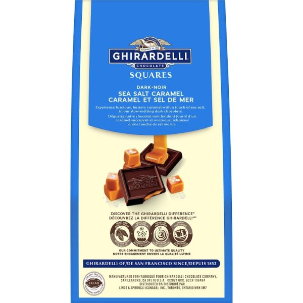 Transform an everyday moment into a celebration with GHIRARDELLI Sea Salt and Caramel Dark Chocolate Squares. Made with premium ingredients and perfect for sharing, these delectable, individually wrapped dark chocolate squares are filled with flowing caramel made even more delicious with a touch of sea salt, for a mouthwatering combination of sweet and salty flavours. To ensure the last bite is as delicious as the first, store your GHIRARDELLI chocolate in a cool, dry place. Since 1852, GHIRARDELLI has produced gourmet chocolate in a range of unforgettable flavours. GHIRARDELLI’s chocolate experts oversee every step of the chocolate-making process, which begins with cacao beans sourced from the world’s finest growing regions. They then roast only the cacao nibs from the heart of the bean for chocolate with a pure, consistent flavour, and further refine it in a process that coats each tiny particle of chocolate with a layer of cocoa butter for added smoothness and intensity.-Dark chocolate squares, 151-gram bag-Individually wrapped chocolates with caramel & sea salt centres-GHIRARDELLI oversees every step of the chocolate-making process, from bean to bar-Made with premium, sustainably sourced cacao beans-Perfect for gifting or treating yourself
