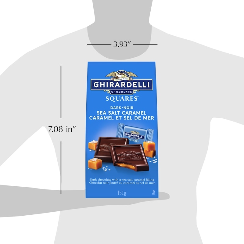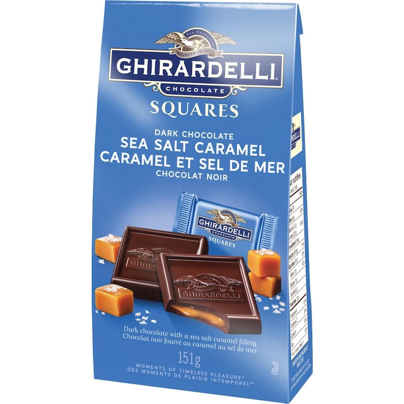 Transform an everyday moment into a celebration with GHIRARDELLI Sea Salt and Caramel Dark Chocolate Squares. Made with premium ingredients and perfect for sharing, these delectable, individually wrapped dark chocolate squares are filled with flowing caramel made even more delicious with a touch of sea salt, for a mouthwatering combination of sweet and salty flavours. To ensure the last bite is as delicious as the first, store your GHIRARDELLI chocolate in a cool, dry place. Since 1852, GHIRARDELLI has produced gourmet chocolate in a range of unforgettable flavours. GHIRARDELLI’s chocolate experts oversee every step of the chocolate-making process, which begins with cacao beans sourced from the world’s finest growing regions. They then roast only the cacao nibs from the heart of the bean for chocolate with a pure, consistent flavour, and further refine it in a process that coats each tiny particle of chocolate with a layer of cocoa butter for added smoothness and intensity.-Dark chocolate squares, 151-gram bag-Individually wrapped chocolates with caramel & sea salt centres-GHIRARDELLI oversees every step of the chocolate-making process, from bean to bar-Made with premium, sustainably sourced cacao beans-Perfect for gifting or treating yourself