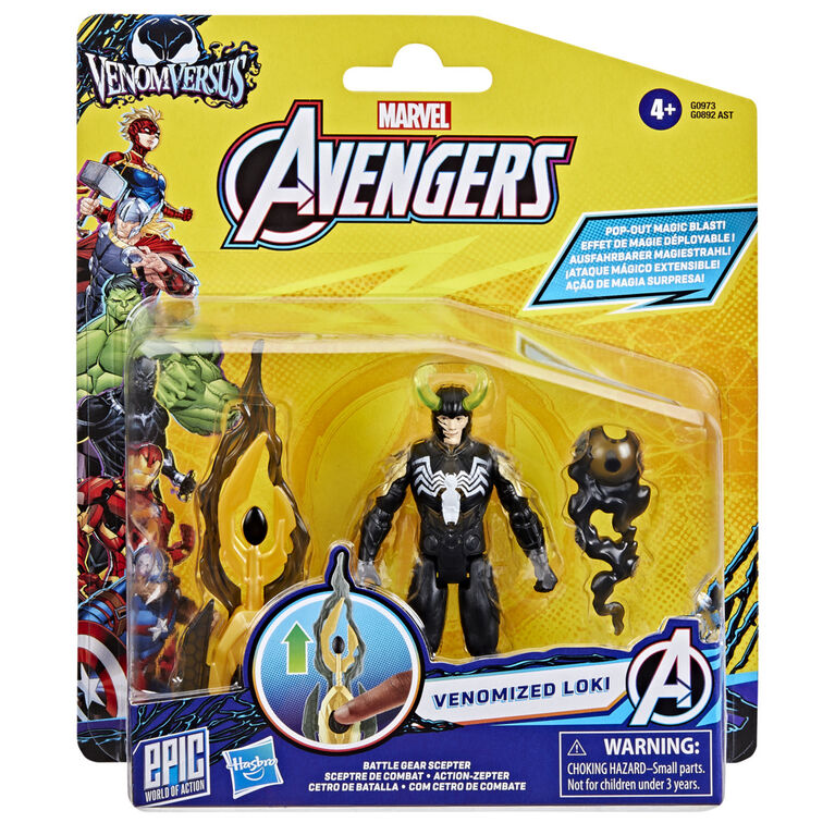 Kids can imagine powering up with Venomized battle gear to face off against the anti-venom Super Heroes! This Venomized Loki Marvel action figure is a part of Hasbro’s exclusive Epic World of Action series and features Venom-inspired design & deco, as well as poseable limbs. Avengers VenomVersus toys also include Venomized accessories for symbiote-powered action and adventure. This 4-inch-scale (10 cm) figure can’t be missed and will be the perfect gift for kids or addition to any collection of Super Hero figures! Look for more Epic World of Action toys for boys and girls to collect, including figures, playsets, and toy vehicles! (Each sold separately. Subject to availability.) Copyright MARVEL. All trademarks and registered trademarks are the property of their respective owners. HASBRO and all related trademarks and logos are trademarks of Hasbro, Inc.