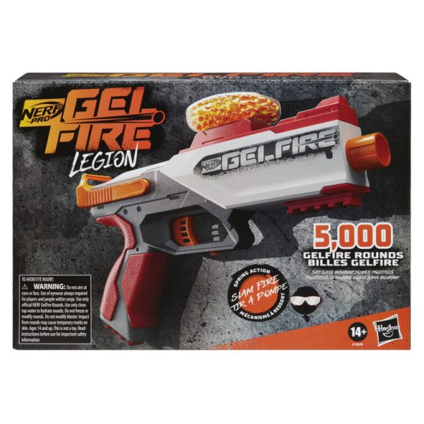 Burst into battle with Nerf Pro Gelfire blasters featuring hydrated rounds that burst on impact! These massive-capacity blasters deliver high-performance blasting to ignite your competitive advantage. Nerf Pro Gelfire rounds come dehydrated in the box, giving you a huge amount of rounds for multiple refills. Add water to hydrate the rounds to prepare them for use. The hydrated rounds fire from the blaster at a high velocity and burst when they hit a target. No need to pick up rounds! The Nerf Pro Gelfire Legion blaster features spring action priming, no batteries needed. It has slam fire action to fire rounds in a continuous stream. This awesome backyard blaster includes a 130-round capacity hopper and 5,000 dehydrated Nerf Pro Gelfire soft super absorbent polymer projectiles. The blaster’s innovative design combines exceptional quality and style. Includes trigger lock to prevent accidental firing and certified protective eyewear. Outdoor use recommended. For ages 14 and up. Nerf and all related properties are trademarks of Hasbro.