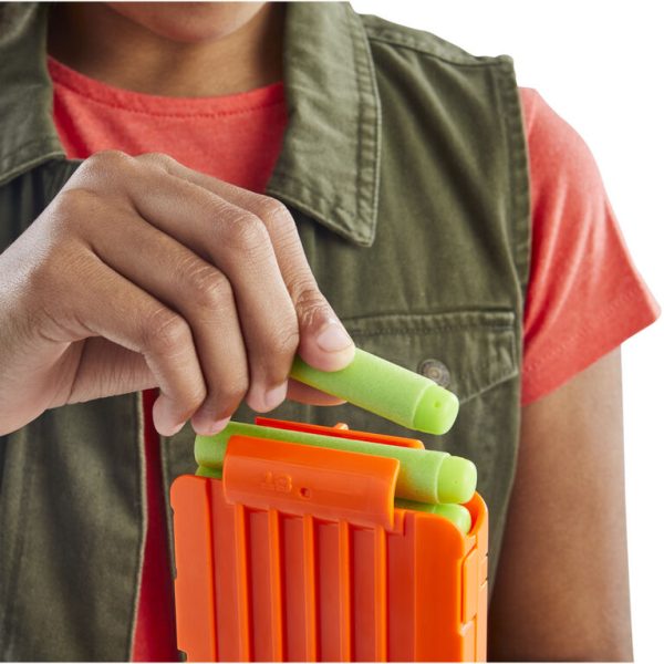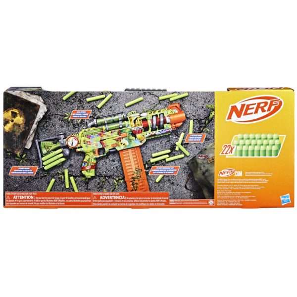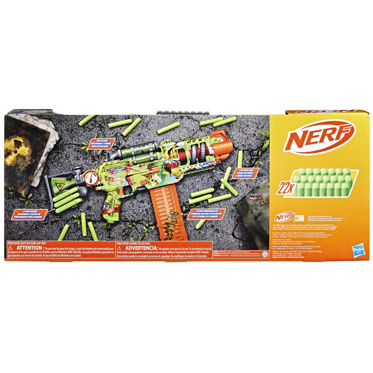 The Nerf Zombie Corrupter dart blaster is fully decorated with colorful, eye-grabbing graffiti decorations on both sides. The blaster’s design creates the look of battle gear that zombie fighters would engineer in a world overrun by the ghoulish undead. The Zombie Corrupter blaster is designed to look as if a zombie fighter engineered a blaster with equipment from a science lab! The bolt-action blaster has an 18-dart removable clip, 6-dart onboard storage, and 2 tactical rails. Includes 22 Nerf Elite foam darts. Featuring fun details from end to end, the Nerf Corrupter blaster is great for zombie fans and a perfect accessory for zombie games and events. Nerf blasters are great indoor and outdoor toys for kids ages 8 and up to enjoy fun, active play. Each sold separately, subject to availability. Eyewear recommended (not included). No batteries required. Nerf and all related properties are trademarks of Hasbro.