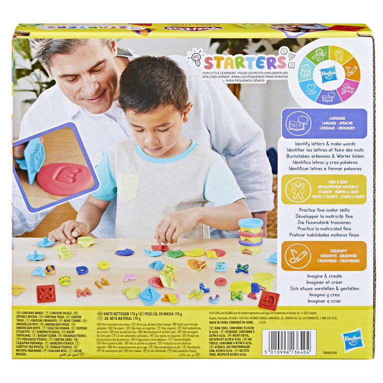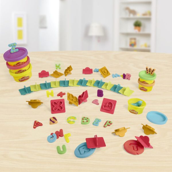 Includes 26 letter stampers and 6 cans of Play-Doh Brand Modeling Compound (compound net weight 6 ounces).