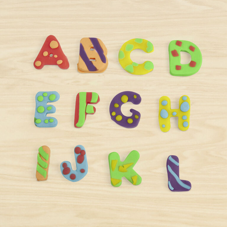 Includes 26 letter stampers and 6 cans of Play-Doh Brand Modeling Compound (compound net weight 6 ounces).