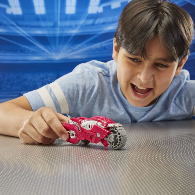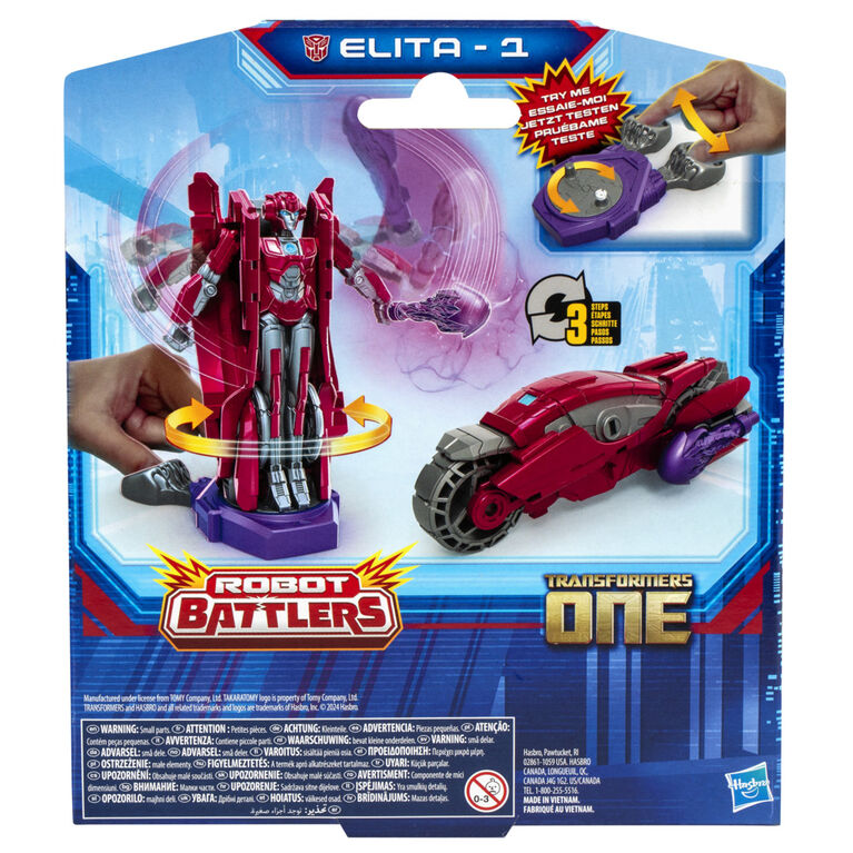 Experience the epic origins of legendary Transformers robots with these Transformers One Battling Robots action figures! This 4.5-inch (11.5 cm) Elita-1 figure converts from robot to Cybertronian motorcycle mode in 3 steps, with simple conversion perfect for Transformers fans age 6 and up. Place the action figure on the Battle Base and slide the finger slots for cool action moves! The figure has articulated head, arms, and legs for awesome action poses. Includes a Battle Base and a sword that attaches in robot mode. This Robot Battlers action figure is inspired by an iconic character from the Transformers movie, Transformers One. Movie-inspired Interactive toys make cool gifts for boys and girls ages 6 and up. Transformers One is the untold origin story of Optimus Prime and Megatron, once friends bonded like brothers, who changed the fate of Cybertron forever. TRANSFORMERS and HASBRO and all related trademarks and logos are trademarks of Hasbro, Inc. 2024 Hasbro. 2024 Paramount Pictures Corporation. All Rights Reserved.