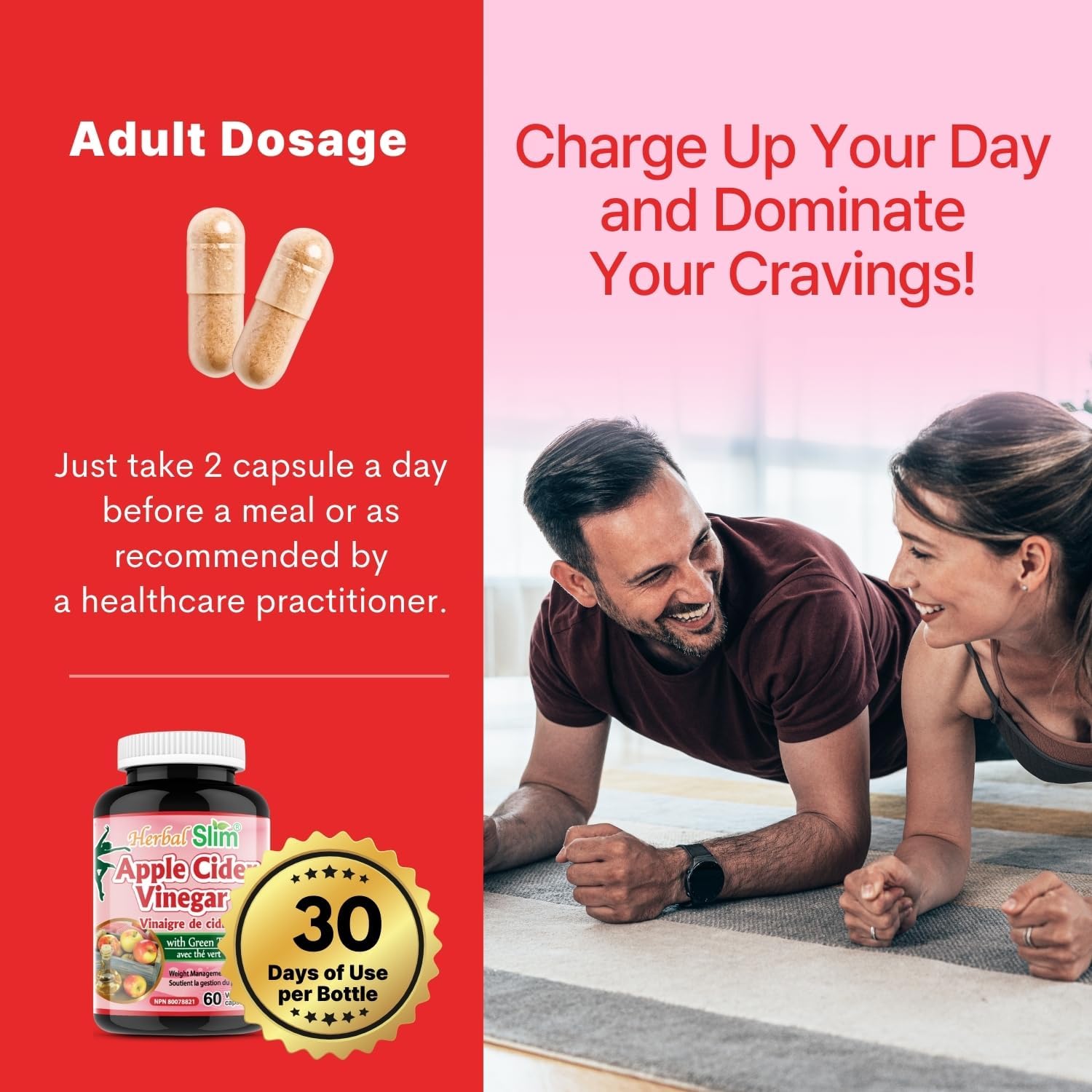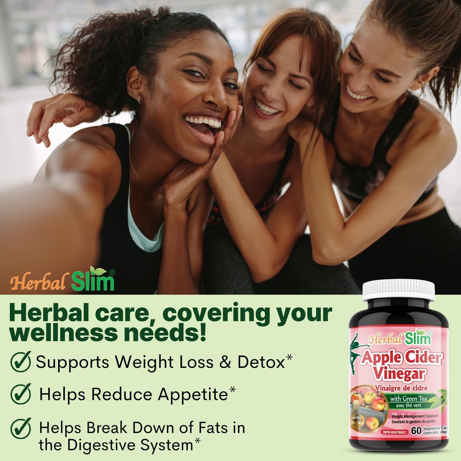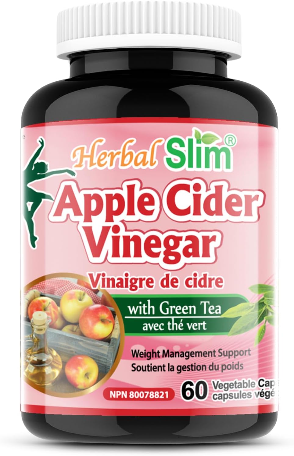 Herbal Slim Apple Cider Vinegar (200mg) with Green Tea Extract (225mg), 60 Vegetable capsules, Non-GMO, Made In Canada