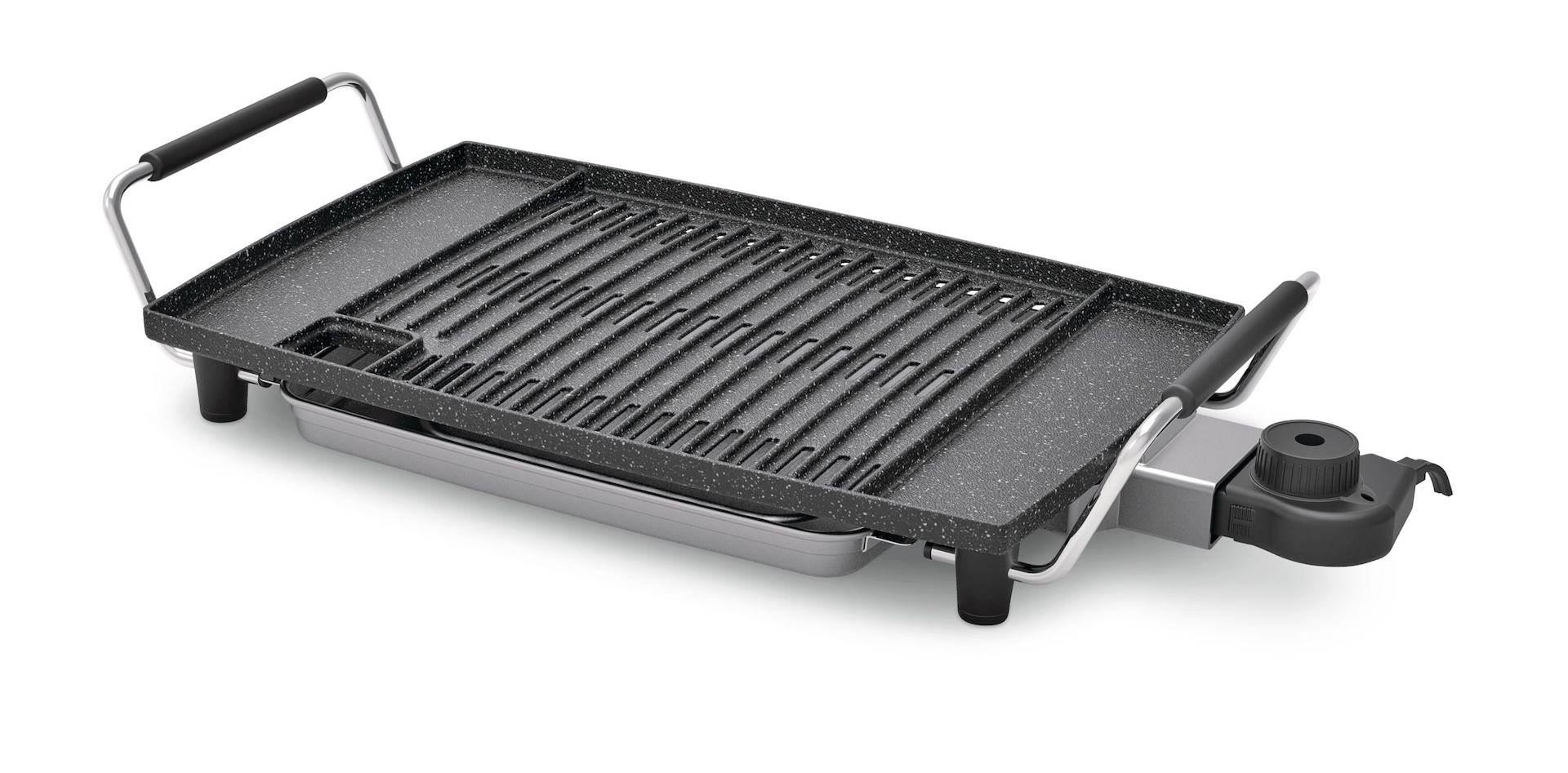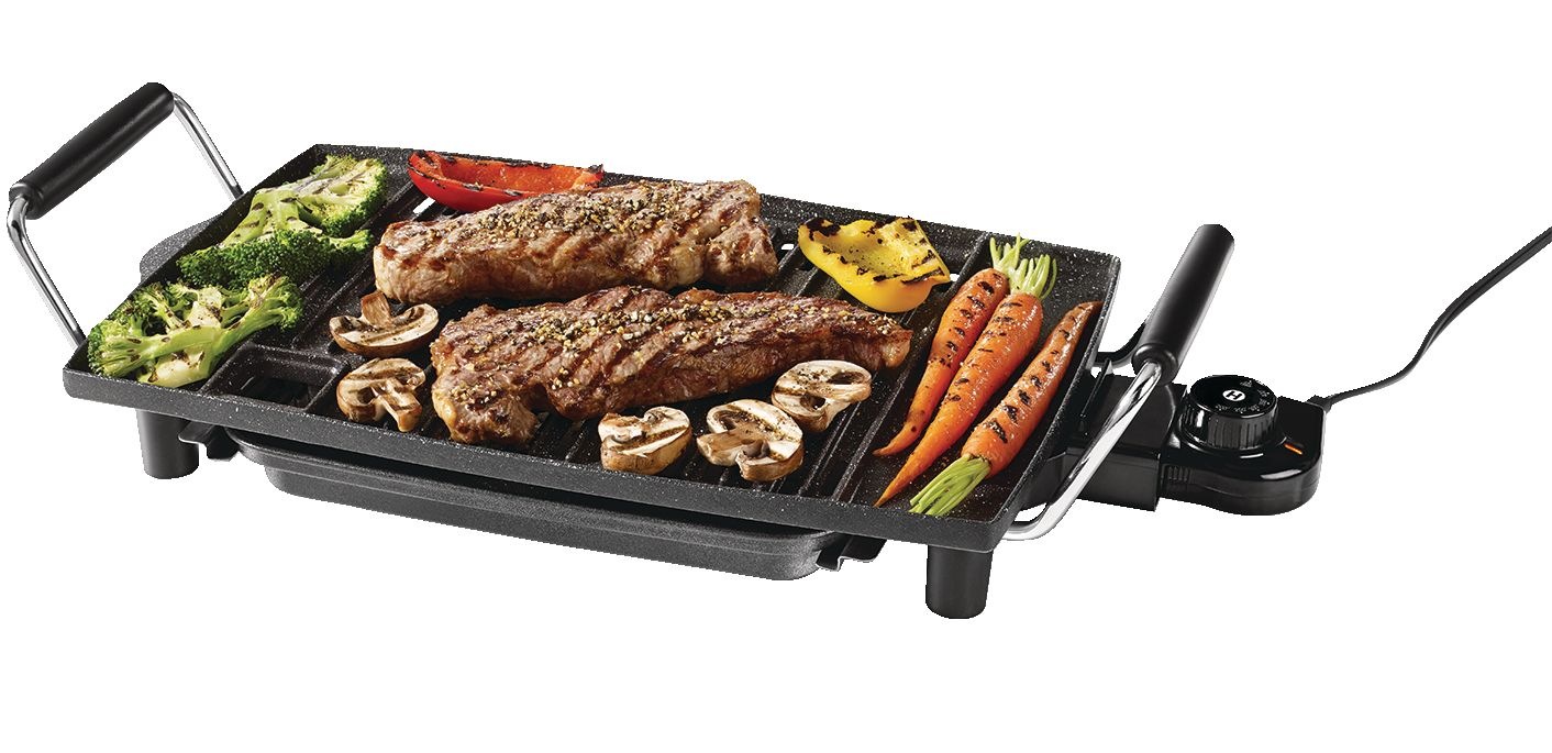 The Heritage The Rock Indoor Non-Stick Electric Smokeless BBQ Grill is the perfect way to prepare delicious BBQ indoors without charcoal or gas. Its patented non-stick Rock technology allows for effortless food release, while the drip tray captures excess oil and grease to reduce smoke. With a spacious cooking surface, this indoor BBQ grill features a durable cast aluminum plate that evenly distributes heat. Adjust the temperature with ease and when finished cooking, simply remove the dishwasher-safe drip tray and plate for quick cleanup.