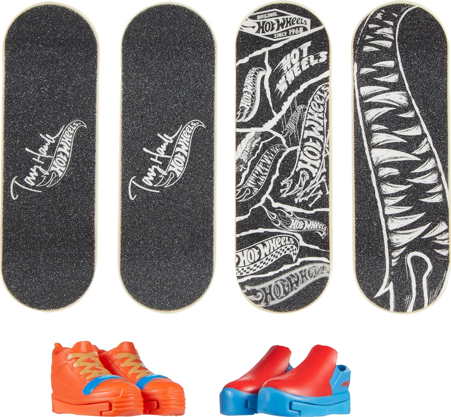 Hot Wheels Skate Tony Hawk Fingerboard & Removable Skate Shoes Multipack, 4 Fully Assembled Boards, 2 Pairs of Skate Shoes, 1 Exclusive Set (Styles May Vary)