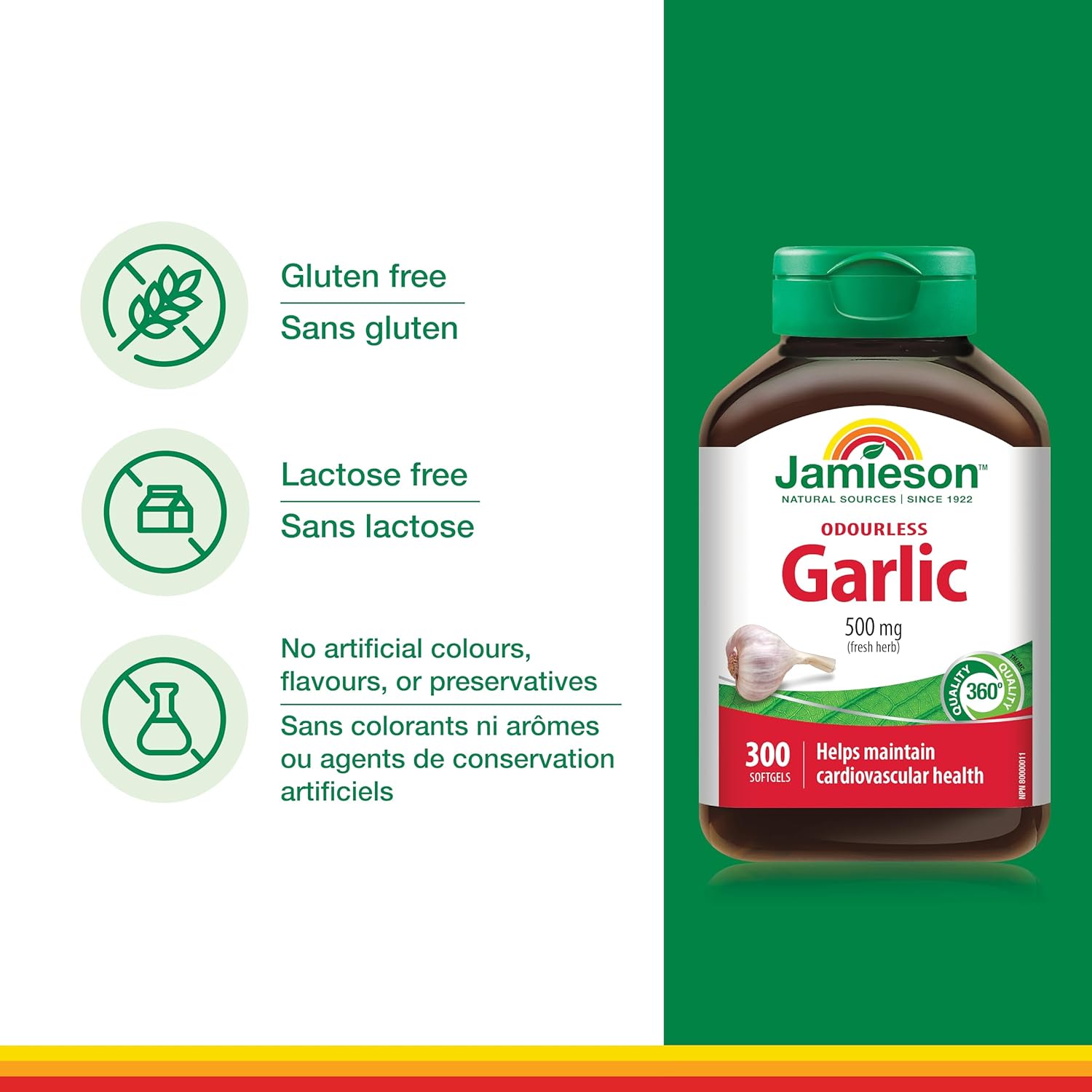 Jamieson Odourless Garlic 500 mg, Supports Heart Health, and Provides Immune Support. Non-GMO, Gluten-Free, 300 Softgels, Proudly Canadian