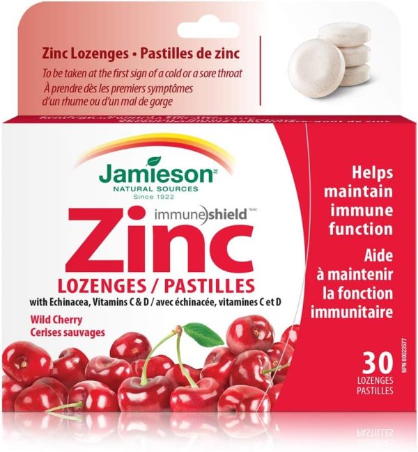 Jamieson Zinc Lozenges Wild Cherry Flavour, with Echinacea, Vitamin C and Vitamin D3, Soothes Sore Throat, and Provides Cold and Flu Symptom Relief. Gluten-Free, No Artificial Colours, Flavours or Preservatives, 30 Count, Proudly Canadian