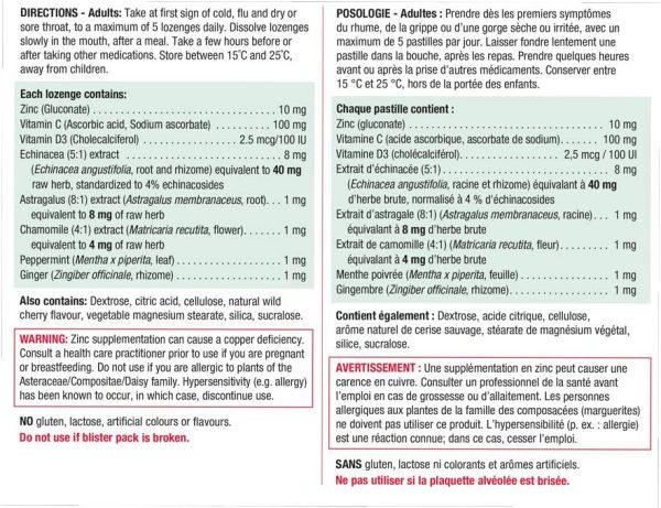 - TAKE AT FIRST SIGN OF COLD: Formulated with Zinc Citrate, Vitamin C, Vitamin D3, and Echinacea to help strengthen your immune system and fight off early cold symptoms