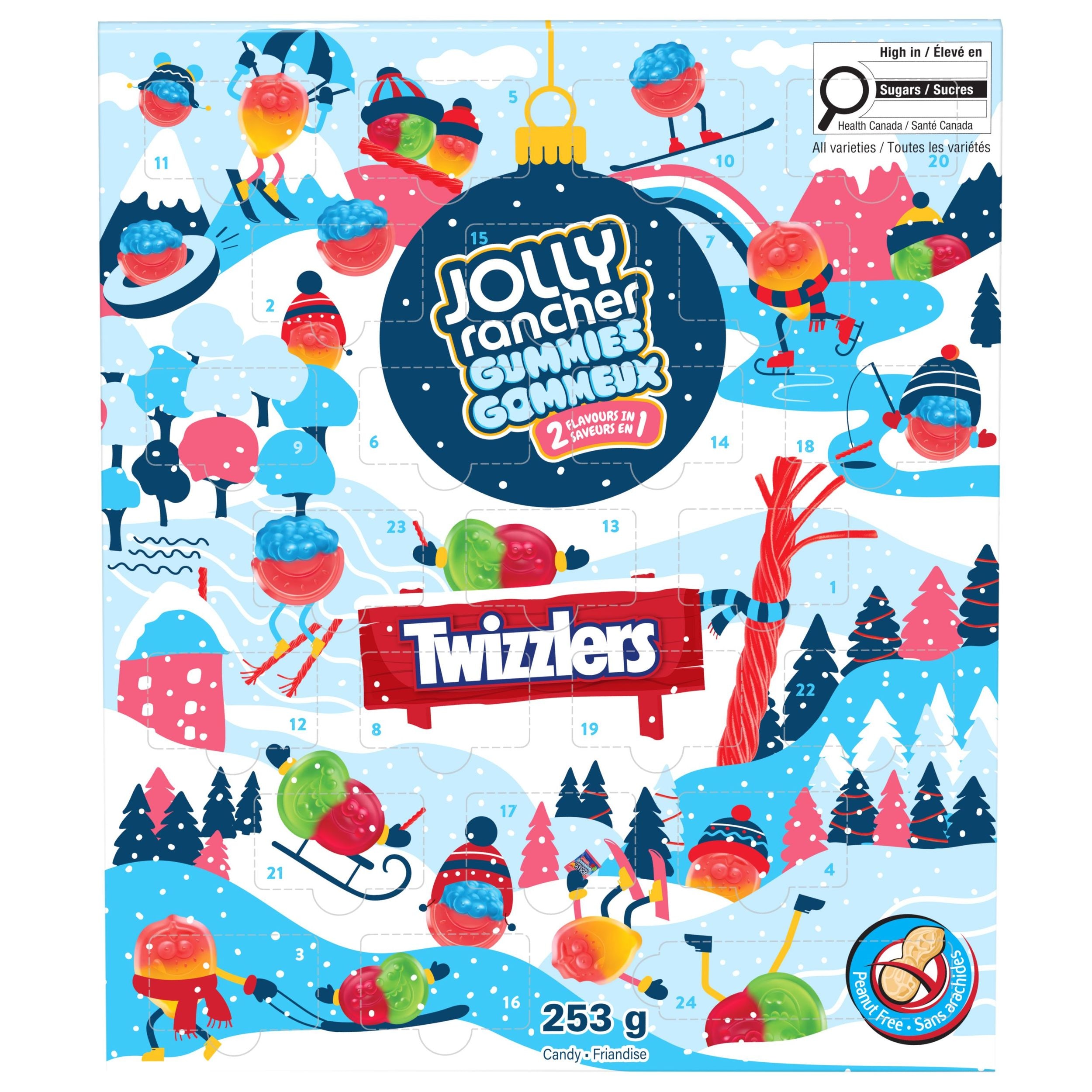 Celebrate the holiday season with the Jolly Rancher and Twizzlers Advent Calendar. This festive calendar offers a delightful surprise each day, featuring a mix of Jolly Rancher Gummies and a special Twizzlers Pull-n-Peel Cherry candy. Perfect for adding a touch of sweetness to your countdown to Christmas.