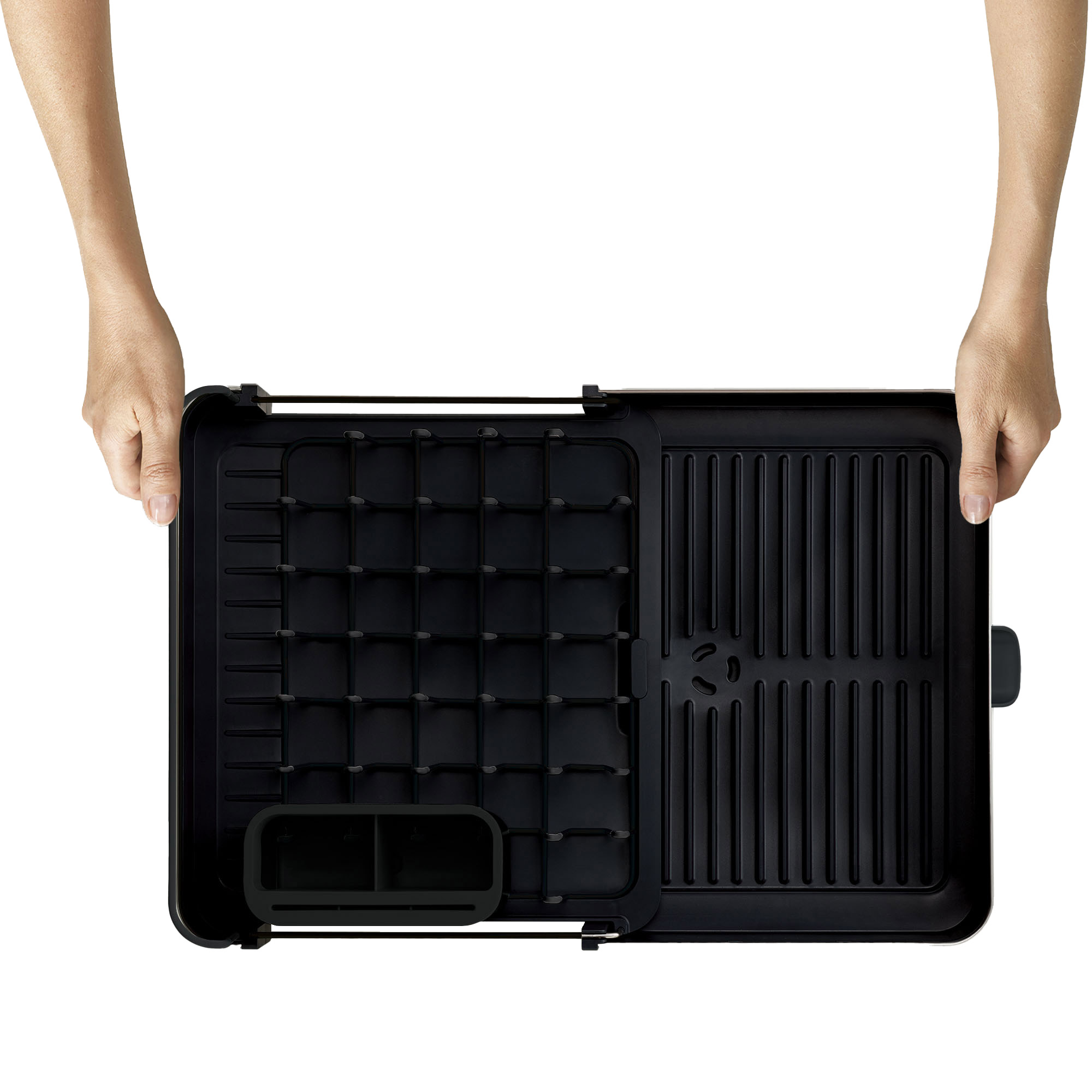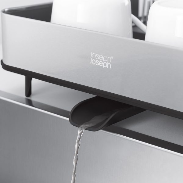 The design extends to fit more items. It has a movable spout to drain water, a dedicated draining space for cutlery and grooves that prevent water from becoming trapped under glasses and bowls.