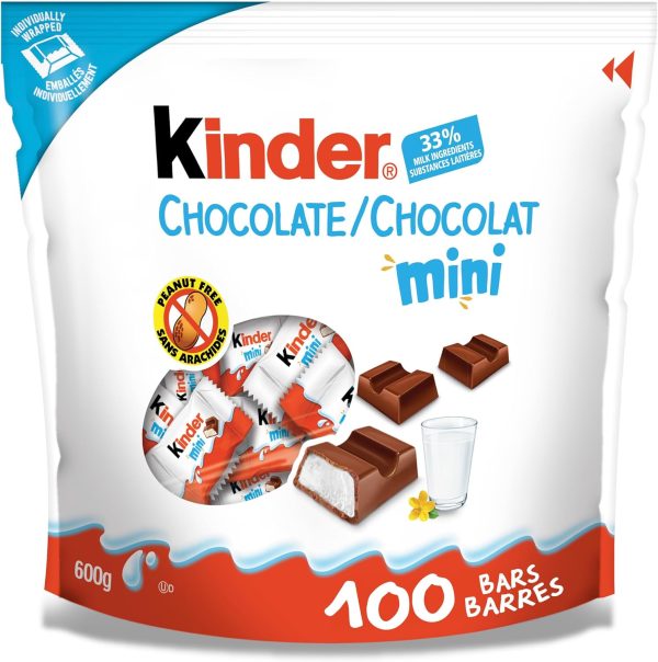- KINDER CHOCOLATE/CHOCOLAT Mini: Enjoy this delicious chocolatey treat with a milky filling in this 600g family pack containing 100 individually wrapped chocolates.