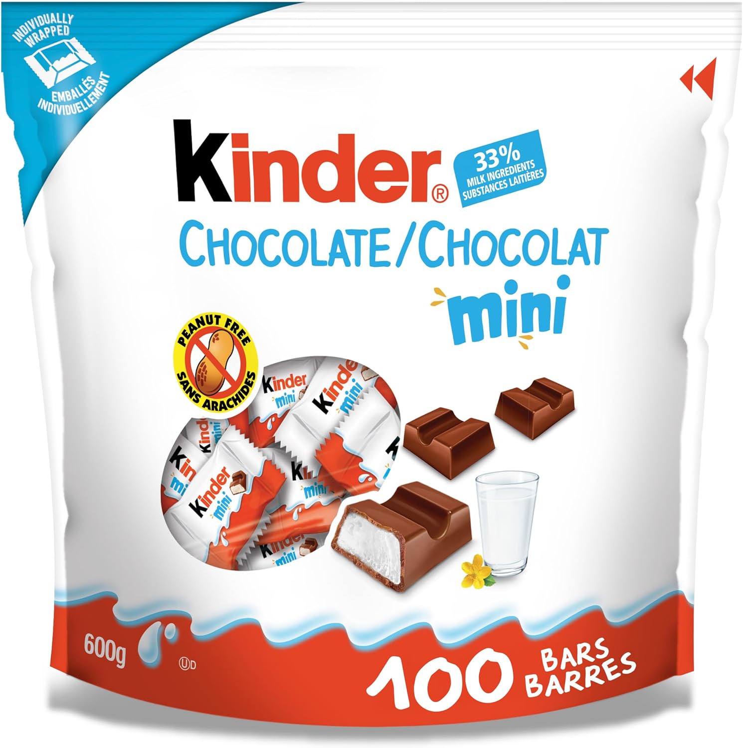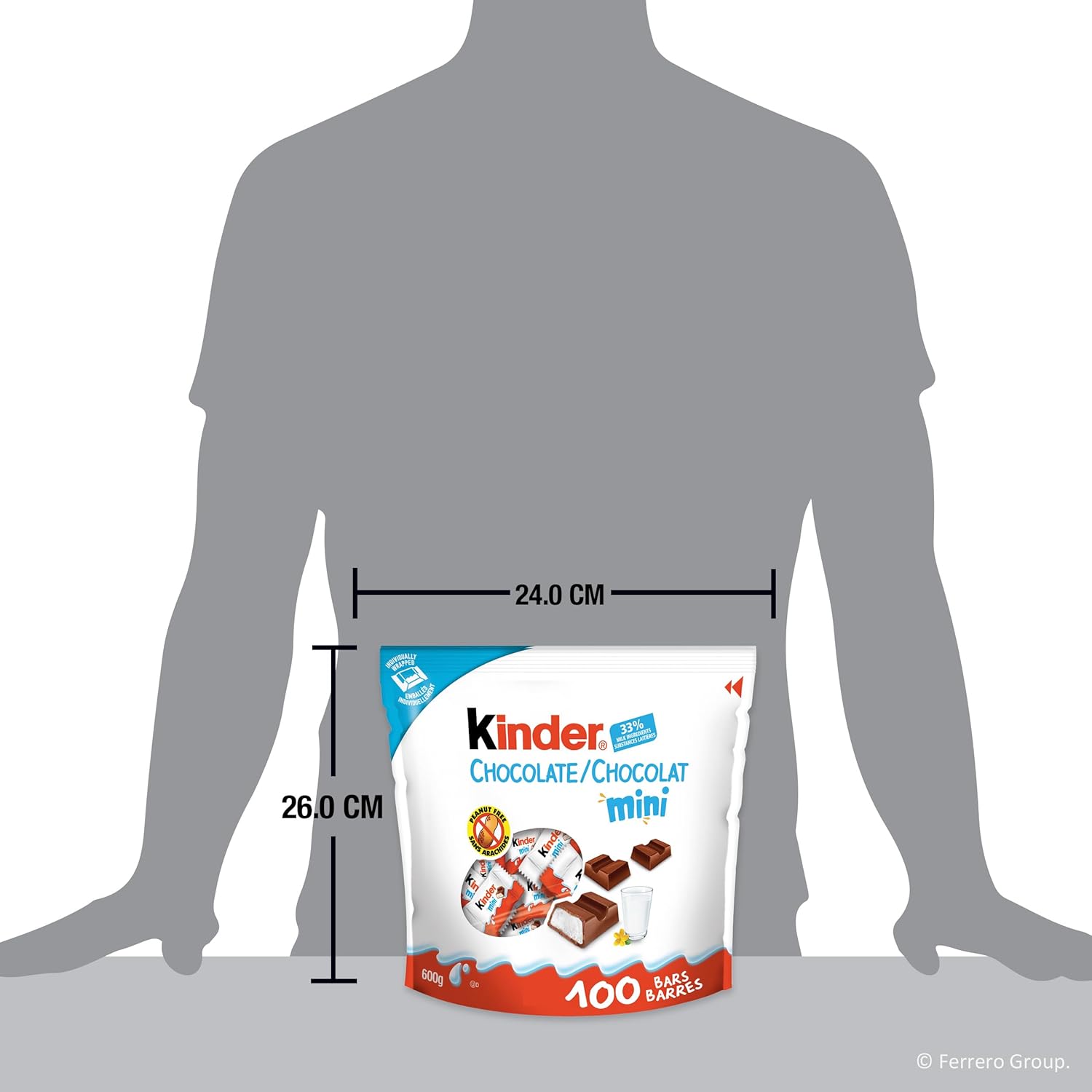 - KINDER CHOCOLATE/CHOCOLAT Mini: Enjoy this delicious chocolatey treat with a milky filling in this 600g family pack containing 100 individually wrapped chocolates.