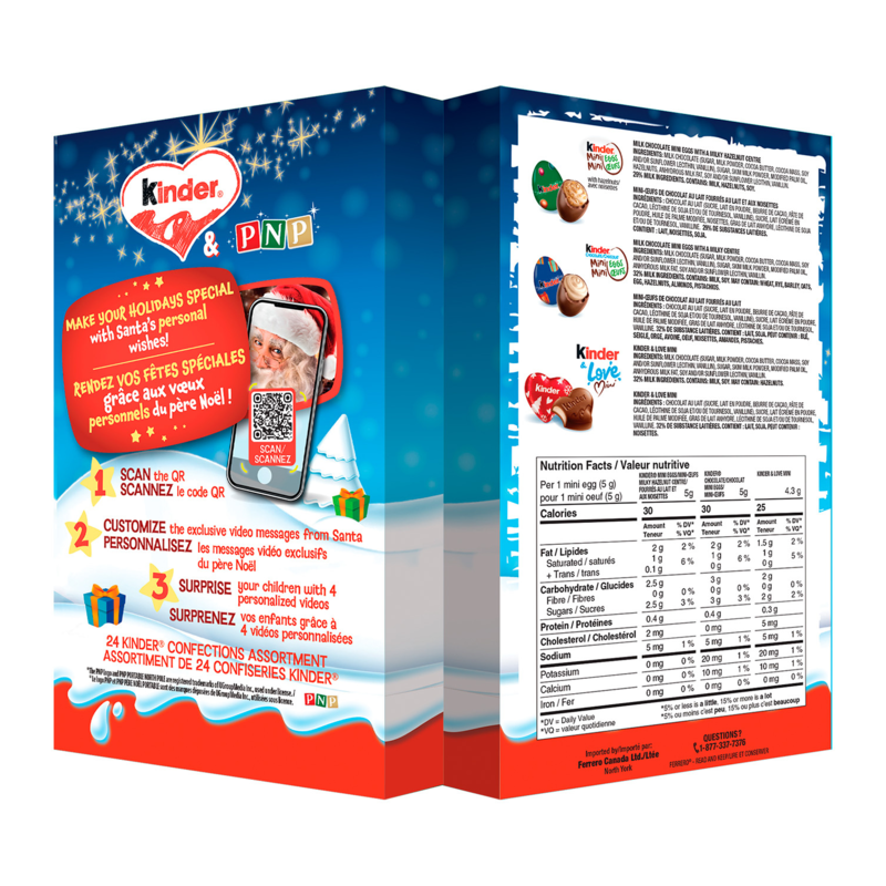 - DELICIOUS TREATS: Featuring KINDER MINI EGGS (Hazelnut Filling), KINDER MINI EGGS (Milky Filling), and KINDER AND LOVE MINI.
