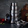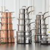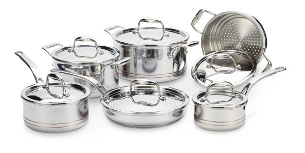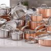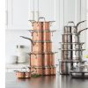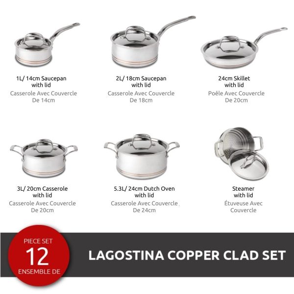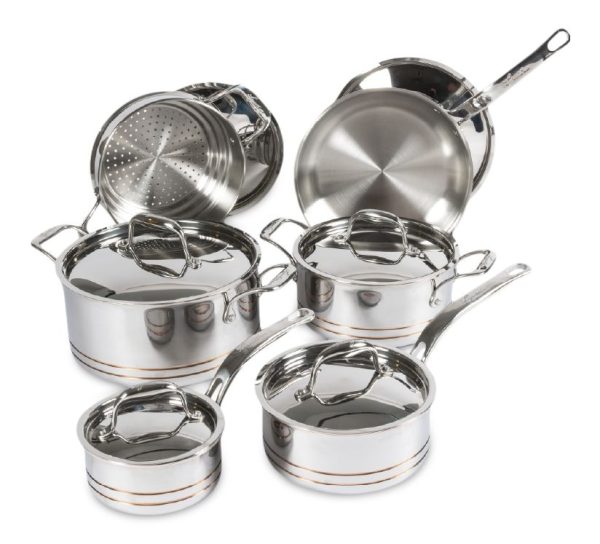 This Lagostina Copper Clad Stainless Steel Set is for connoisseurs who expect flawless results, no matter what they are cooking up. The 12-piece cookware set is built of ultra-resilient stainless-steel bodies and handles for durability, combined with the best in heat conduction: aluminum and copper. The unique 5-ply construction contains a heat-responsive copper core between aluminum layers for precise temperature control and unsurpassed heat retention. The beautiful detailing means you will want to take this cookware from the stovetop to the table to show off your cooked foods in style. Speaking of stovetops, each piece is compatible with all types of cooking surfaces, including induction.