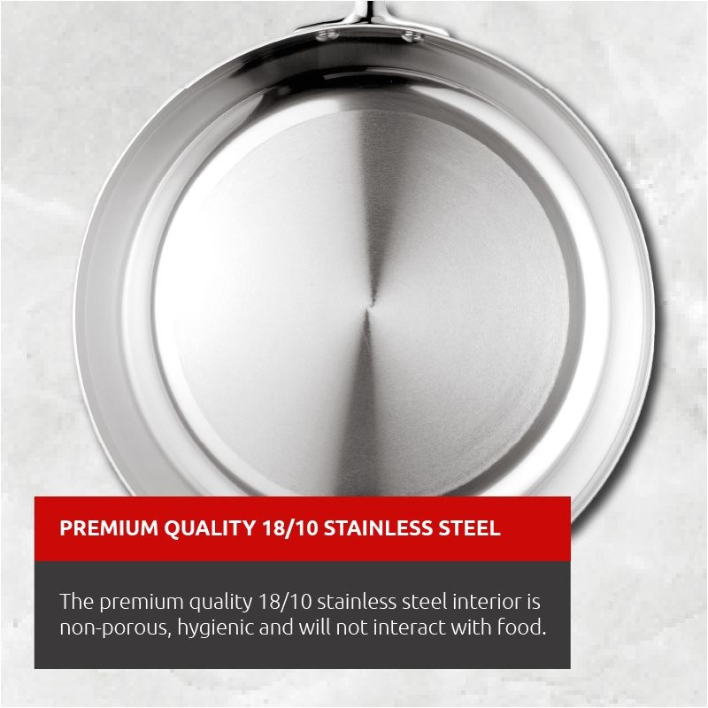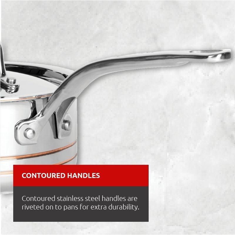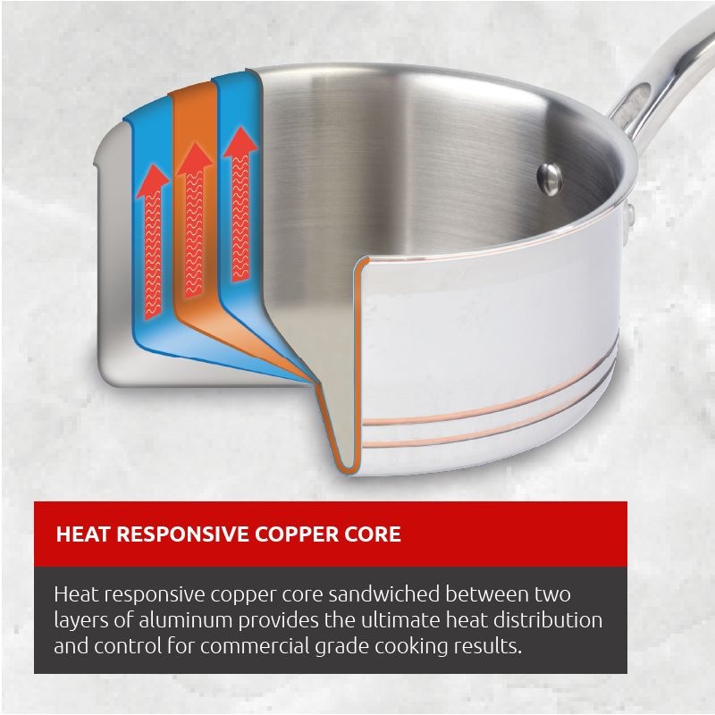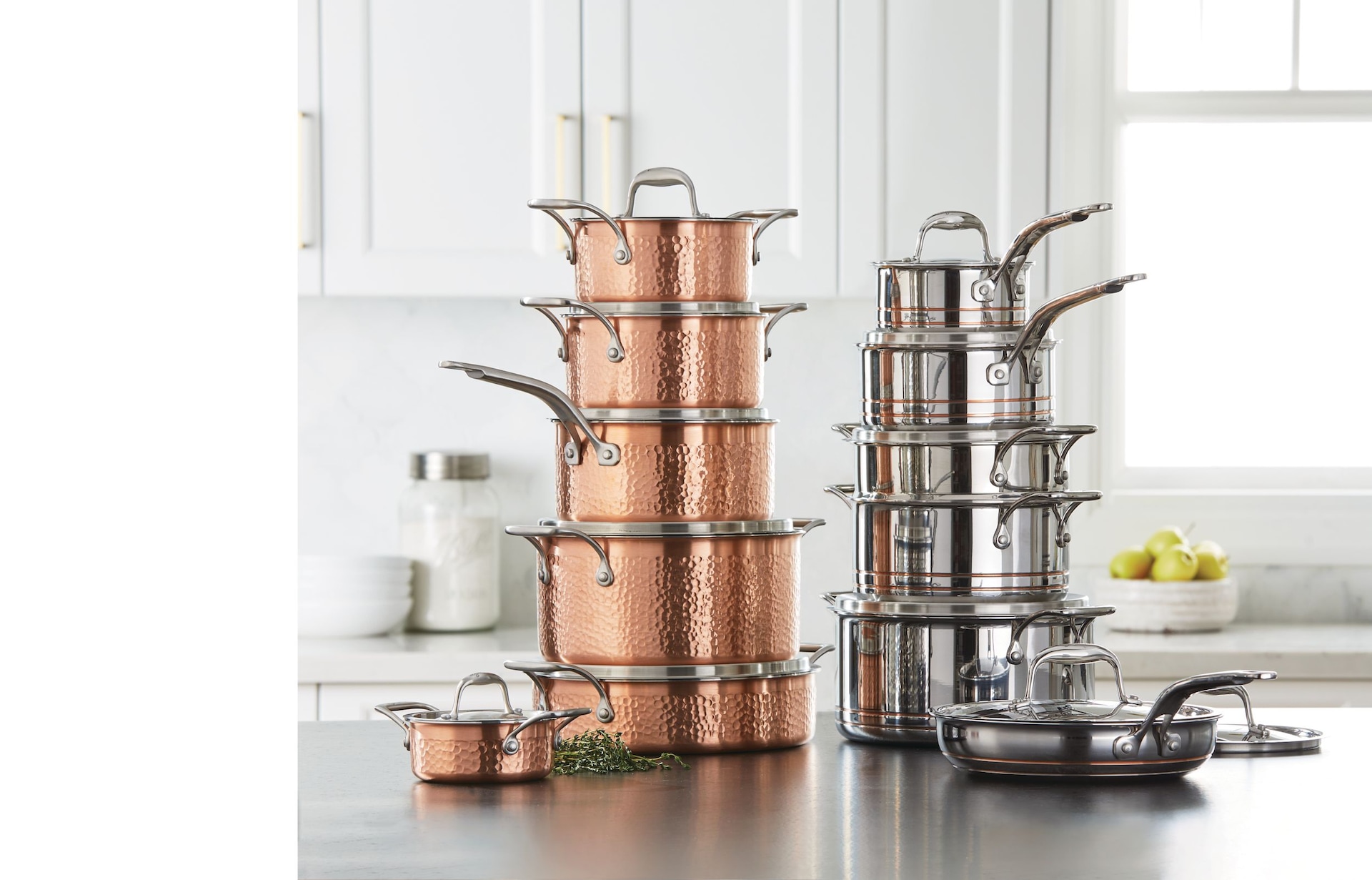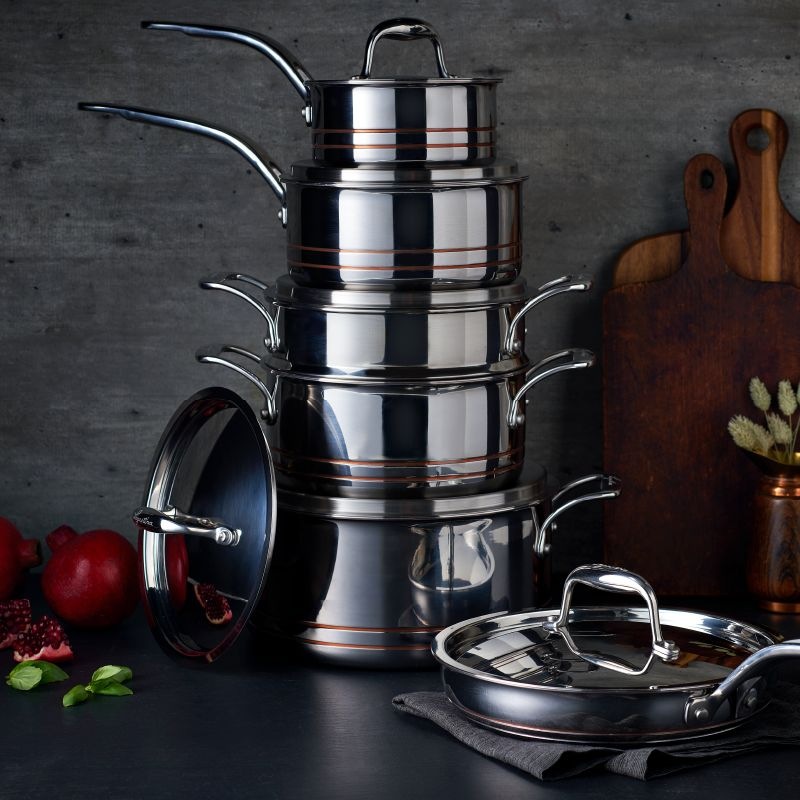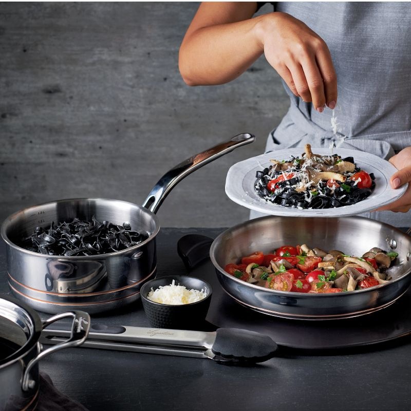 This Lagostina Copper Clad Stainless Steel Set is for connoisseurs who expect flawless results, no matter what they are cooking up. The 12-piece cookware set is built of ultra-resilient stainless-steel bodies and handles for durability, combined with the best in heat conduction: aluminum and copper. The unique 5-ply construction contains a heat-responsive copper core between aluminum layers for precise temperature control and unsurpassed heat retention. The beautiful detailing means you will want to take this cookware from the stovetop to the table to show off your cooked foods in style. Speaking of stovetops, each piece is compatible with all types of cooking surfaces, including induction.