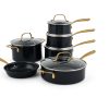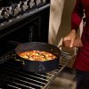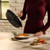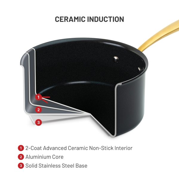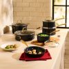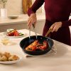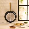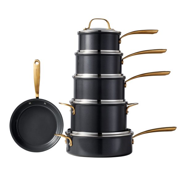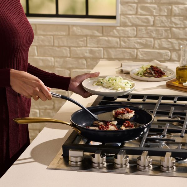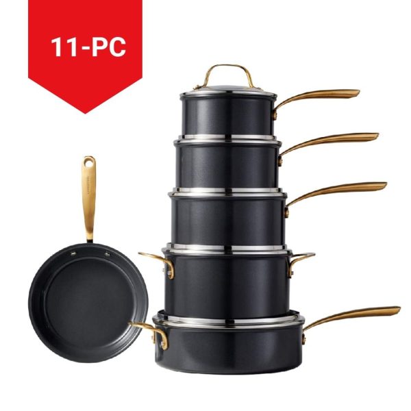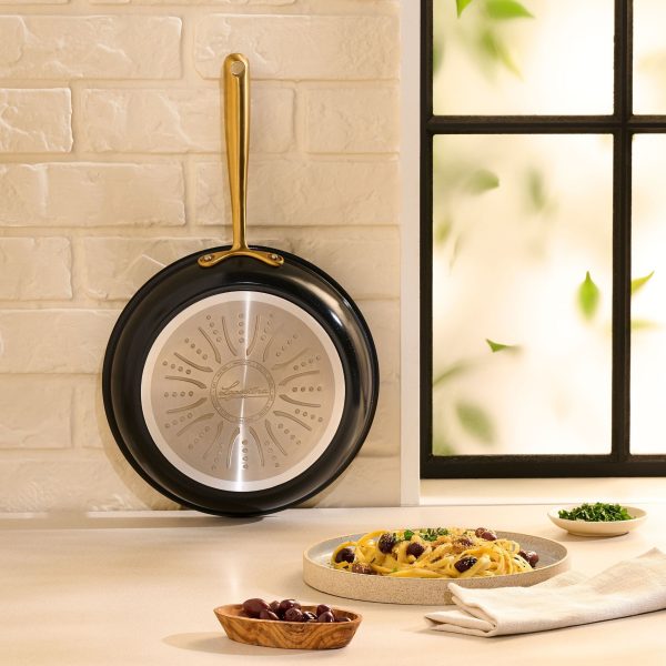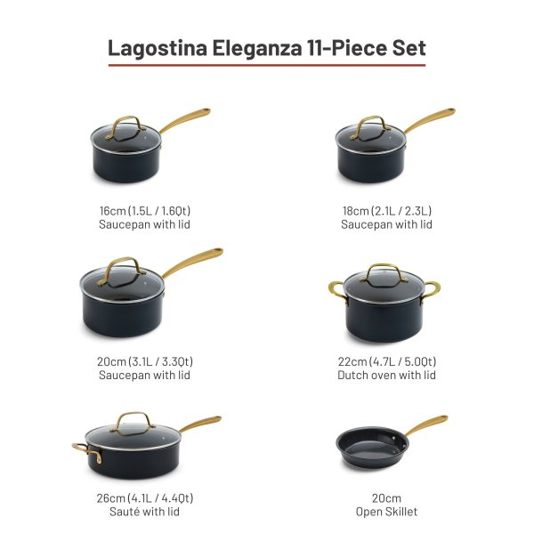 Discover the Lagostina Eleganza Collection that blends exquisite design with culinary innovation. Engineered with a 2-coat advanced ceramic non-stick interior, it ensures effortless cooking and cleanup, free from PFOA and PTFE. The sleek black metallic surface resists stains and facilitates food release with minimal oil, promoting healthier meals. With a ceramic coating 20 times harder than traditional non-stick, it allows the cookware to withstand higher temperatures. Crafted with a thick aluminum body, this cookware heats up swiftly and distributes heat evenly for superior cooking results, complemented by stay-cool gold stainless steel handles for a secure grip. Oven safe up to 450°F/ 232°C, it features a solid induction base for compatibility across all cooktops, exuding elegance in every detail.