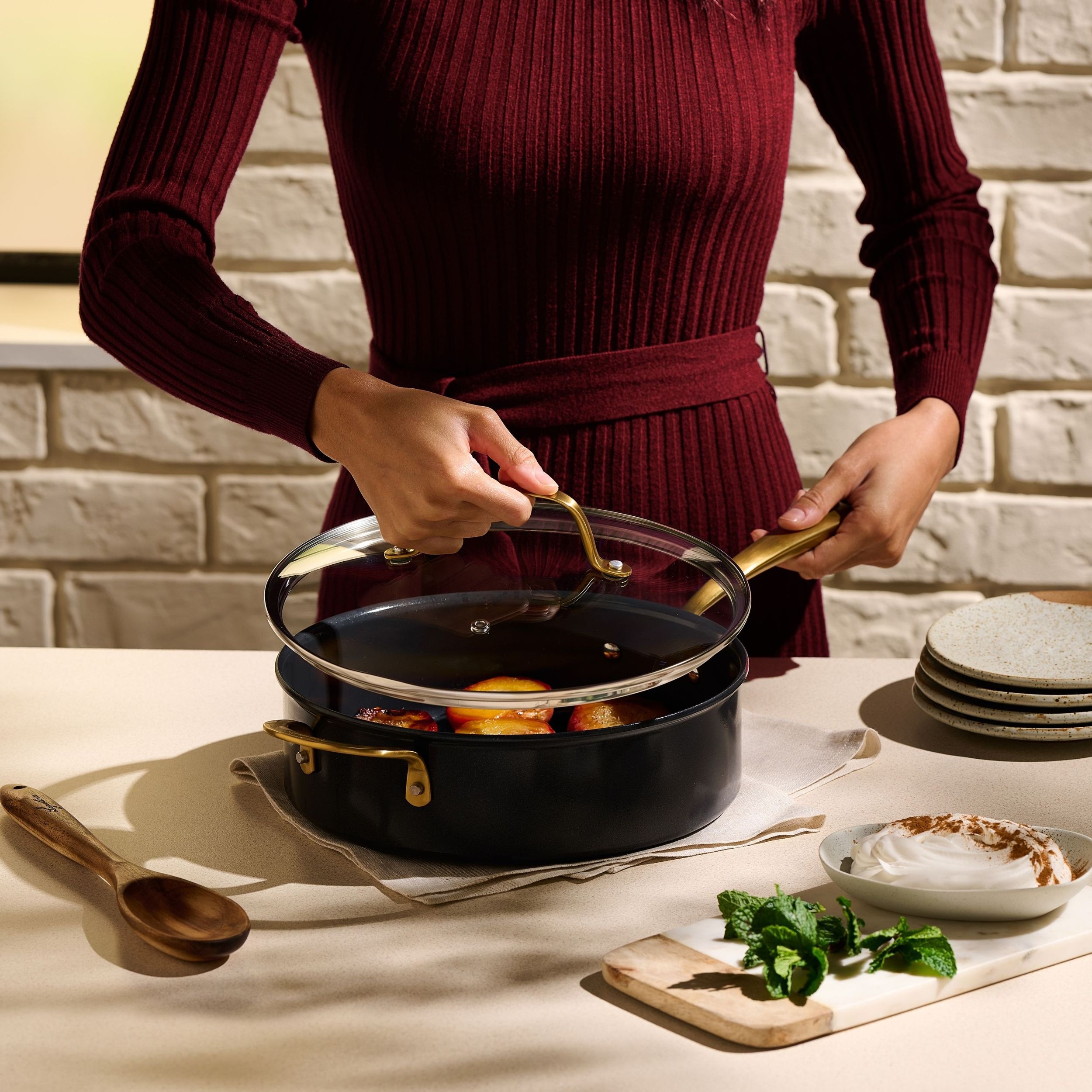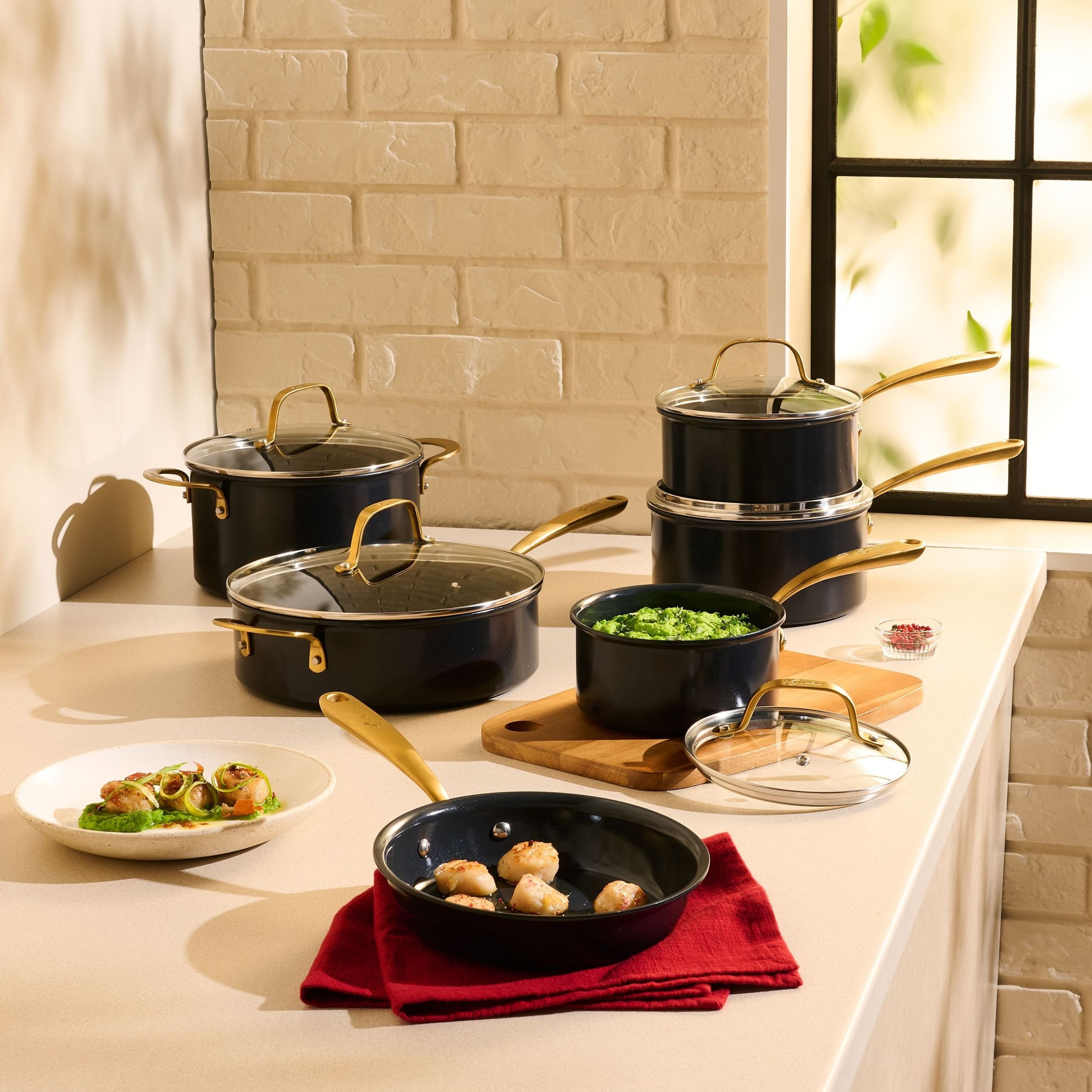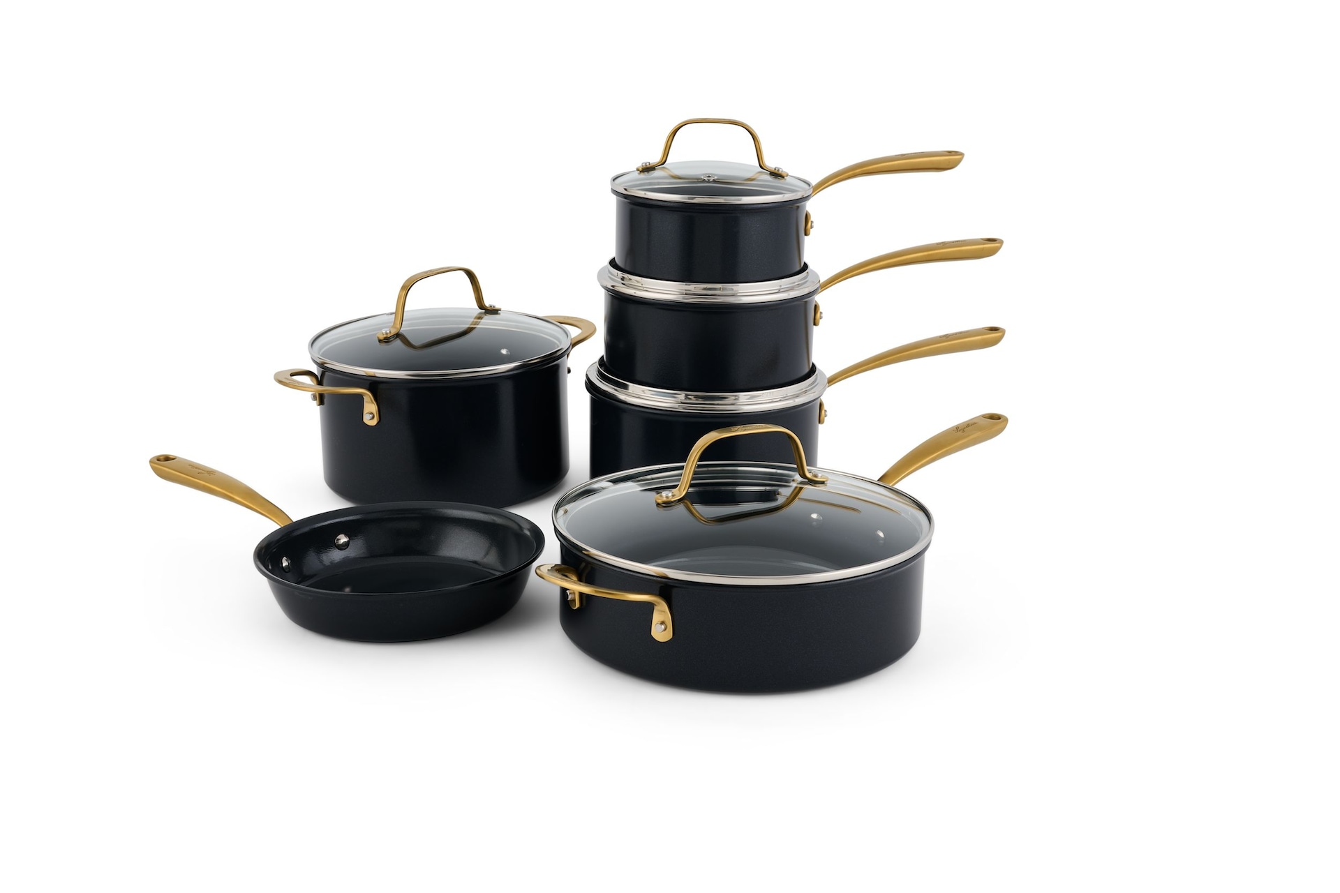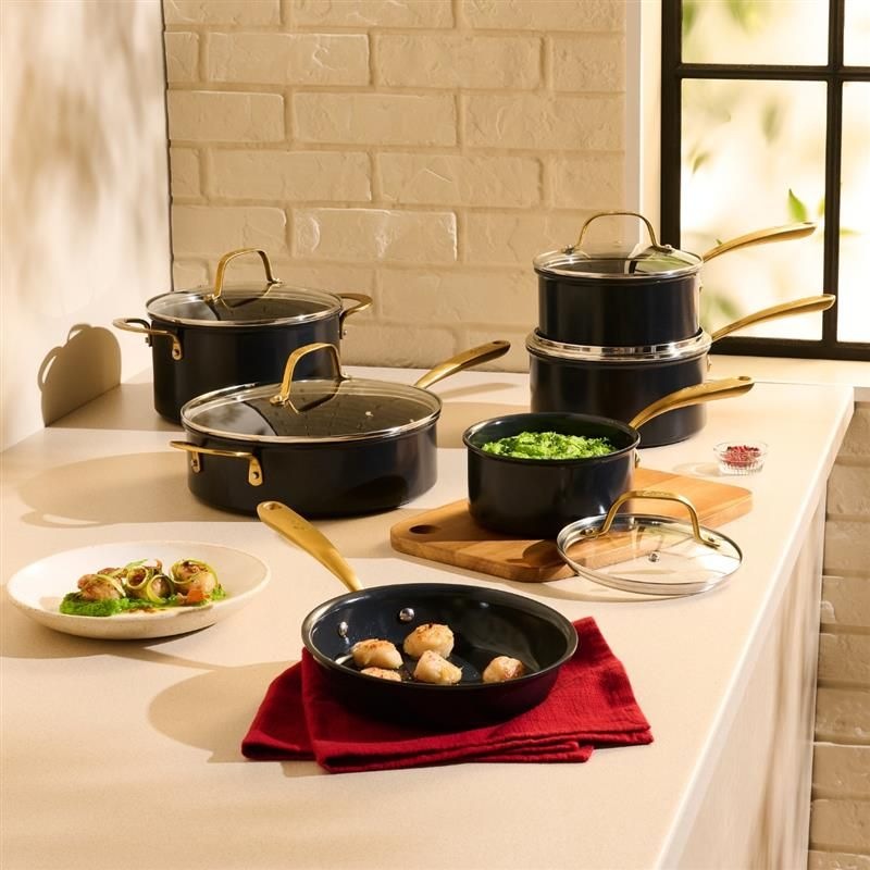 Discover the Lagostina Eleganza Collection that blends exquisite design with culinary innovation. Engineered with a 2-coat advanced ceramic non-stick interior, it ensures effortless cooking and cleanup, free from PFOA and PTFE. The sleek black metallic surface resists stains and facilitates food release with minimal oil, promoting healthier meals. With a ceramic coating 20 times harder than traditional non-stick, it allows the cookware to withstand higher temperatures. Crafted with a thick aluminum body, this cookware heats up swiftly and distributes heat evenly for superior cooking results, complemented by stay-cool gold stainless steel handles for a secure grip. Oven safe up to 450°F/ 232°C, it features a solid induction base for compatibility across all cooktops, exuding elegance in every detail.