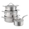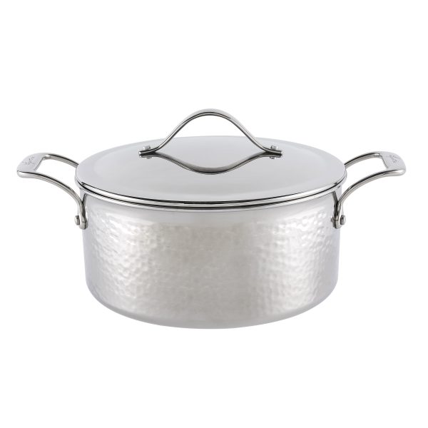 Transform your cooking experience with this 8-piece set featuring a 5-ply construction to guarantee a warm and delicious meal for the entire family and ensuring even heat distribution and superior cooking results. The non-porous stainless steel interior remains hygienic and pure, while the hammered mirror-polished exterior adds a touch of sophistication. Enjoy easy handling with ergonomic riveted handles and tight-sealing stainless steel lids, and pour effortlessly with flared edges. Compatible with all cooktops, including induction, and dishwasher safe, this set combines elegance with practicality for a refined cooking journey.