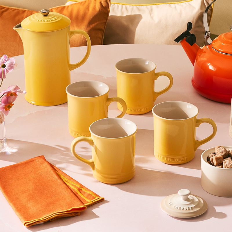 Each piece of our store dinnerware is crafted in the same careful process as all our store stoneware – with a colorful, durable exterior enamel that matches other stoneware flawlessly. From hot chocolate and coffee to single servings of soup and even desserts, the .35 L Stoneware Mug features a versatile, sturdy design for everyday use, as well as classic our store embossed lettering and rings around the base.