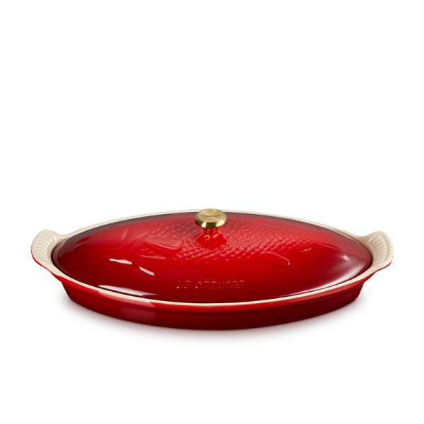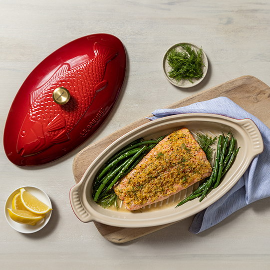 The Fish Baker features a covered oval baking dish embossed with an elegant fish motif and brushed gold knob. A striking presentation from oven to table, it’s perfect not only for baking, roasting, steaming, and broiling all manner of fish recipes – but also for roasting and steaming vegetables and meat, one dish meals and more.