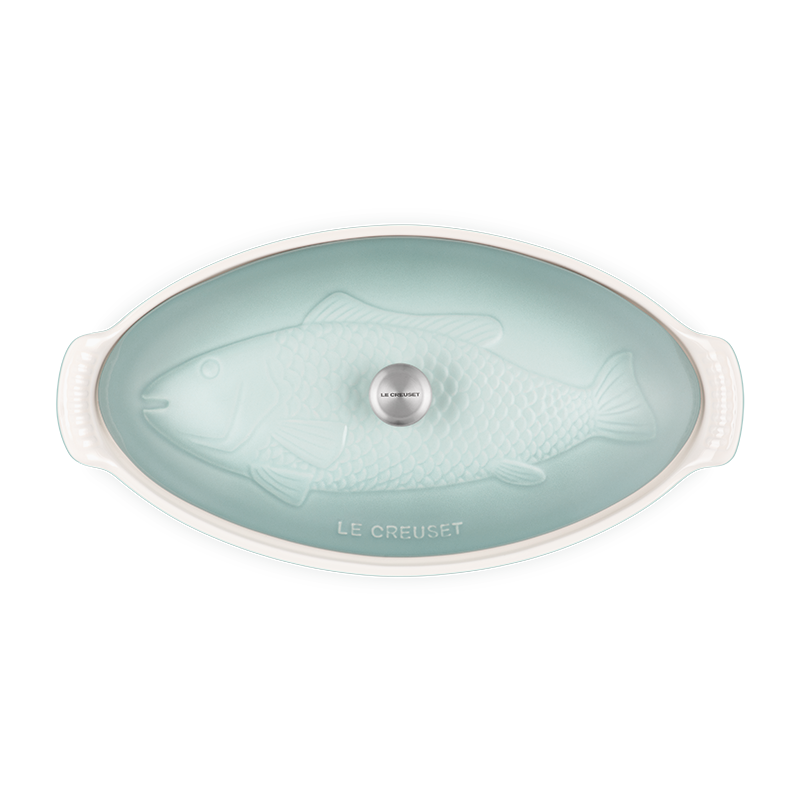 The Fish Baker features a covered oval baking dish embossed with an elegant fish motif and brushed gold knob. A striking presentation from oven to table, it’s perfect not only for baking, roasting, steaming, and broiling all manner of fish recipes – but also for roasting and steaming vegetables and meat, one dish meals and more.