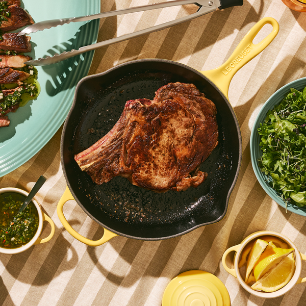 Every kitchen needs an Iron Handle Skillet. The Iron Handle Skillet has earned a reputation as a kitchen workhorse, tackling a variety of your favourite recipes. This versatile piece of cookware is particularly great for stovetop cooking and oven baking. In fact, its matte black interior enamel develops a natural patina over time, making it ideal for searing and frying.