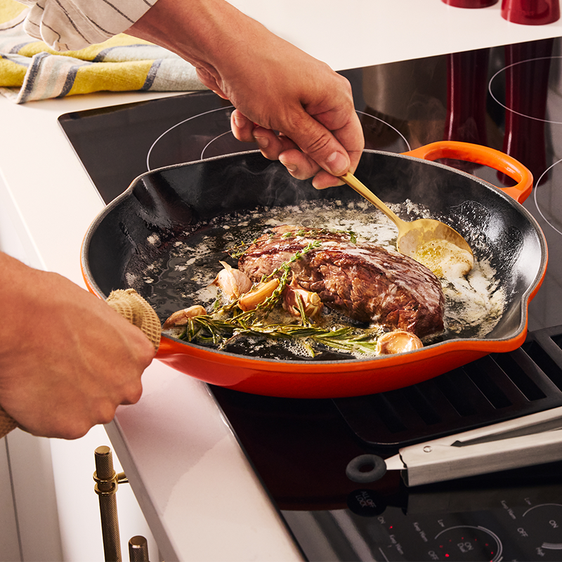Every kitchen needs an Iron Handle Skillet. The Iron Handle Skillet has earned a reputation as a kitchen workhorse, tackling a variety of your favourite recipes. This versatile piece of cookware is particularly great for stovetop cooking and oven baking. In fact, its matte black interior enamel develops a natural patina over time, making it ideal for searing and frying.
