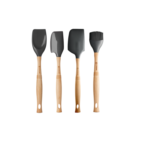 This set includes a medium spatula, a large spatula, a spatula spoon, and a basting brush.