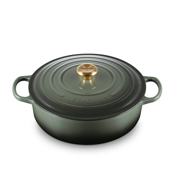The Shallow Round Dutch Oven provides a spacious cooking surface for searing large batches of meat and can even be used for simmering sauces, thanks to its tall sides. Its tight-fitting lid locks in heat, while its sand-colored enamel allows you to easily monitor the progress of recipes as they slow cook.