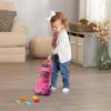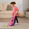 Tiltable handle adjusts to multiple heights for grow-with-me play; attached dust bin collects dust pieces as they are picked up; all pieces fit inside for storage