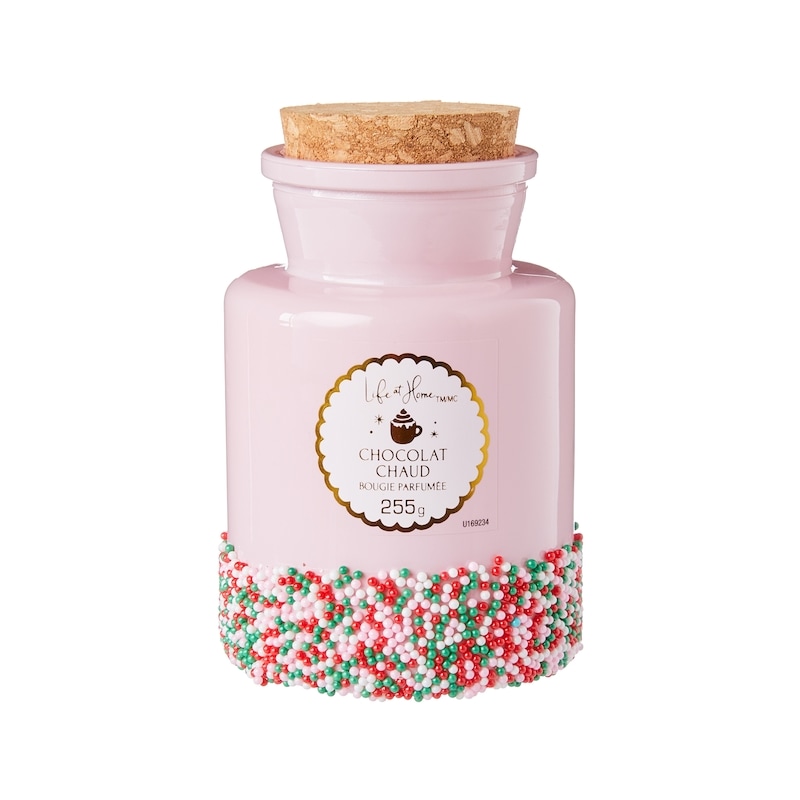 - Colours: Pink jar, white wax, and multicoloured beads