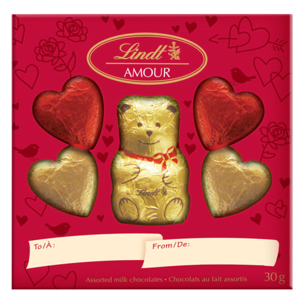 Give the gift of bliss to the special people in your life this Valentine’s Day with the Lindt TEDDY Milk Chocolate Heart Pack. A perfect present for chocolate lovers, this collection of adorable Valentine’s chocolates features one solid milk chocolate Lindt TEDDY and four milk chocolate hearts wrapped in red and gold foils. In addition to tasty Valentine’s gifts, you can also use these colourful Swiss chocolates as festive plate and table decorations for Valentine’s Day meals or as given individually along with Valentine’s cards to friends and family members.