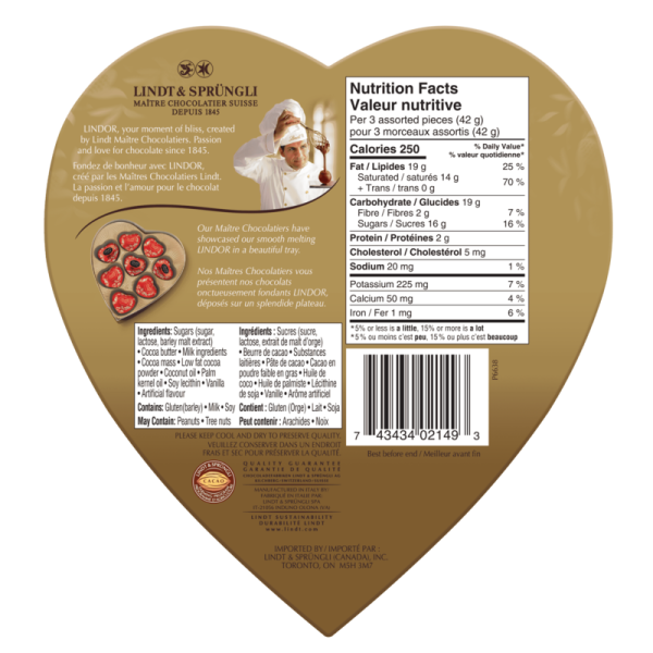 Give the gift of bliss this Valentine’s Day with Lindt LINDOR Amour Assorted Chocolate Hearts. Perfect for gifting, these decadent chocolate hearts in creamy milk chocolate, rich dark chocolate, and sweet white chocolate are individually wrapped in colourful foil and presented in a gold tray to impress any gourmet chocolate lover.