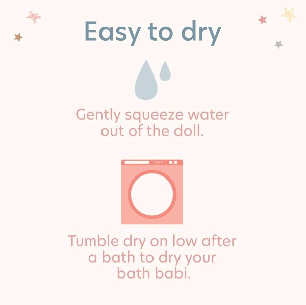 - Easy to Clean: The LullaBaby bath doll is machine washable. When drying after a bath, gently squeeze water out of the plush doll or tumble dry on low.