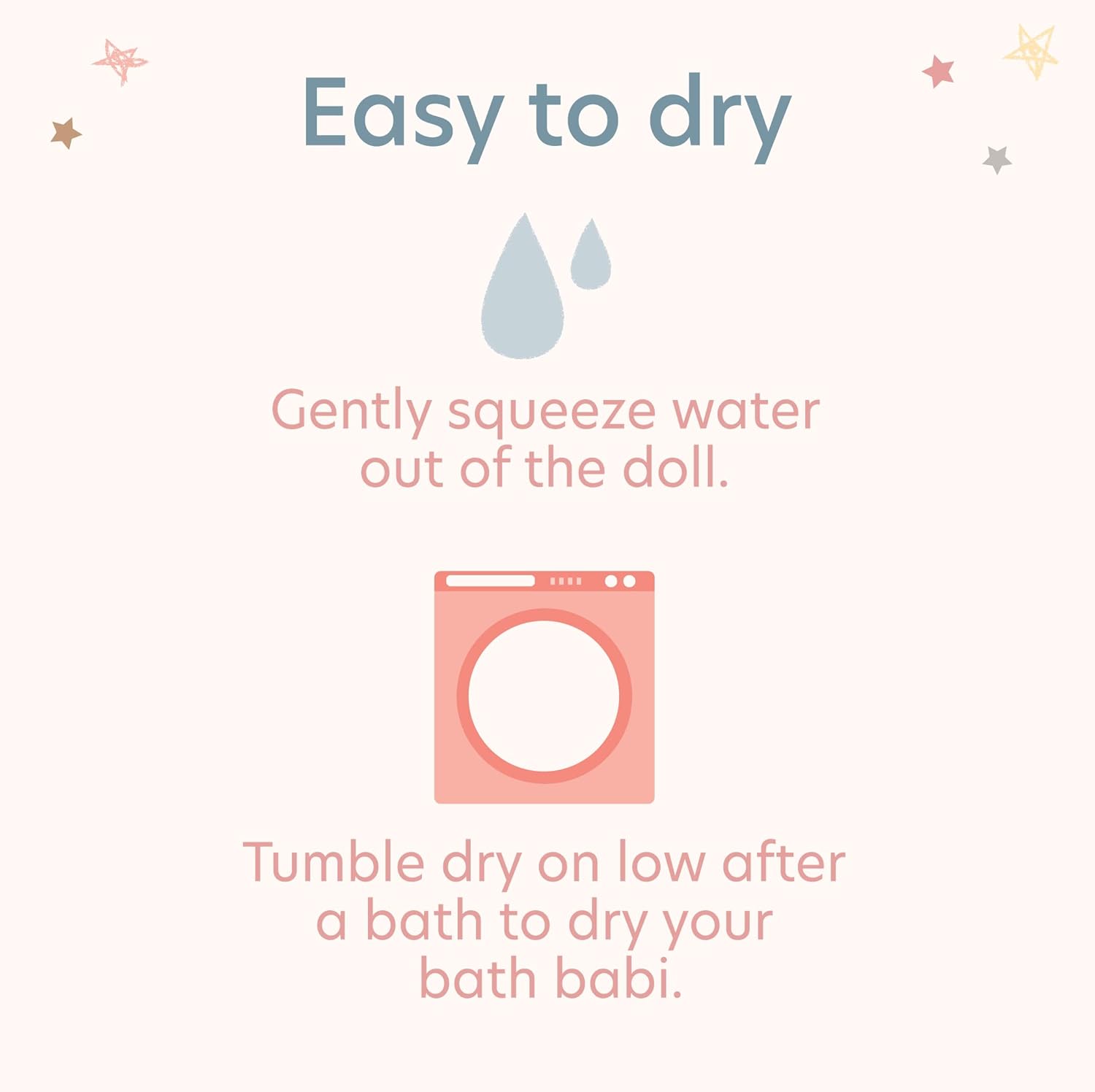 Discover fun and unique playtime moments with the adorable 14-inch babi bath doll, with a water-safe and cuddly soft design. Explore bathtime routines with children thanks to her removable top, towel, and adorable bath ducky! This 14-inch bath doll is perfectly sized for young nurturers to cuddle, carry, and love. Babi dolls encourage children to develop empathy, kindness, and caring qualities the more they play and grow with babi. Collect babi dolls and other beautifully designed nursery accessories to care for babi at home and on the go. To dry dolls after a bath, gently squeeze water out of the bath babi and tumble dry on low.