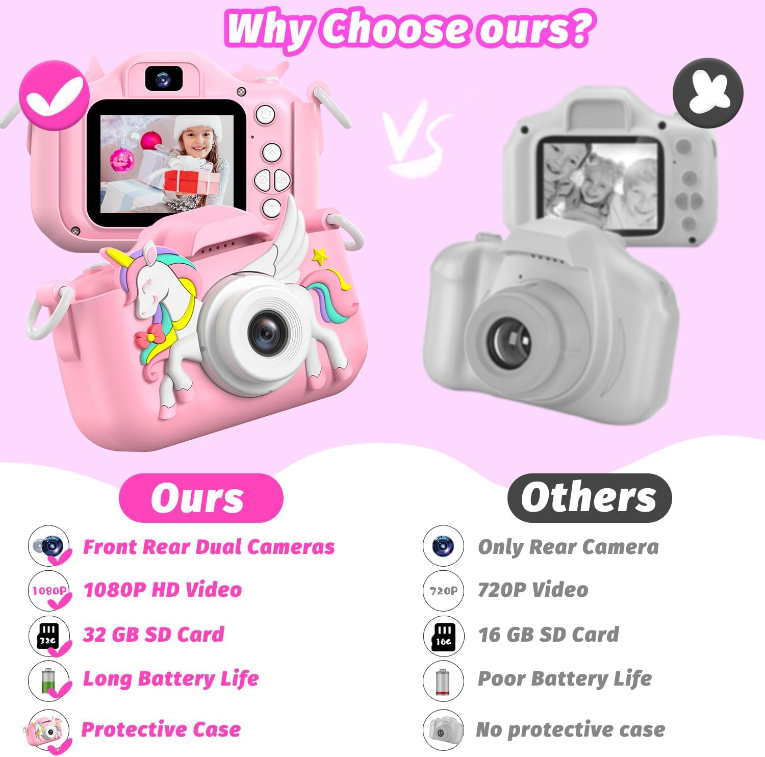 - High Definition and Selfie Camera: Our children cameras can take clear photos and 1080P videos, greatly improve the quality of photos and videos, help kids record the beautiful scenes and wonderful moments of life. Front rear dual-lens, kids can selfies easily. With the function of Digital zoom, Timelapse, Loop recording, etc, more interesting for kids to learn photography, 2 inch Large IPS screen design, protects kid's eyes, is comfortable to read, perfect mini video camera toys for kids